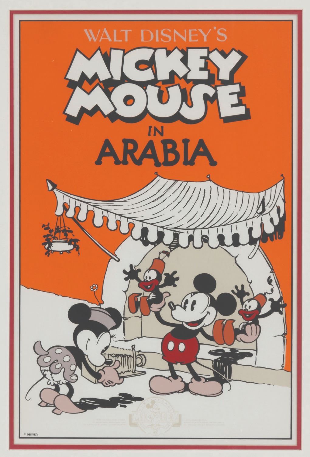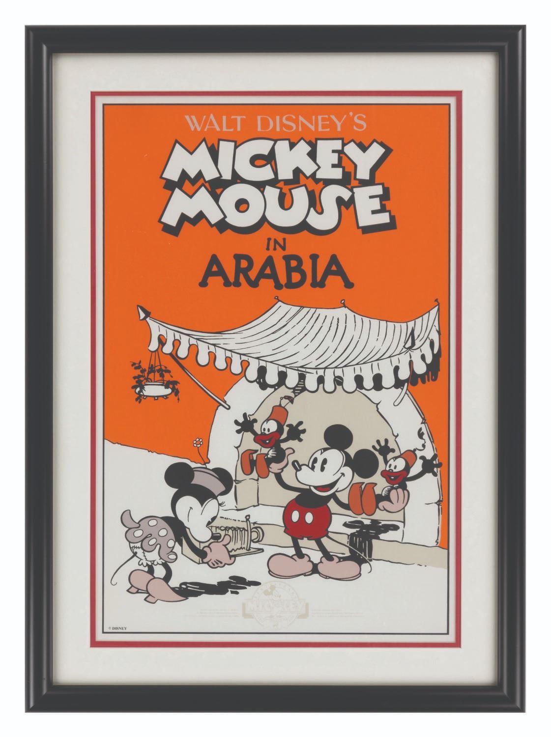 (Disney, 1989) A French reproduction of the "Mickey Mouse in Arabia" 1932 poster for the Sixty Years of Mickey Celebration. This short was the last Mickey Mouse cartoon distributed by Columbia Pictures. Measuring 16" x 24" in a 21.5" x 29.5" frame, the print is in fine condition.
