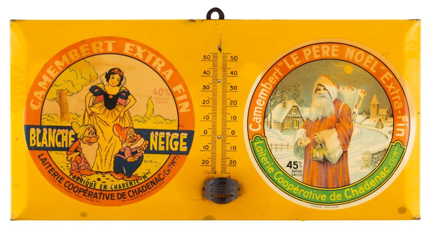 (Laiterie, 1930s) A Laiterie Cooperative De Chadenac Camembert Cheese tin and plastic sign & thermometer base featuring Snow White, Bashful, and Happy, along with Santa Claus. Measuring 5.25" x 10.75", the piece is in good condition, missing the original thermometer, with a few minor chips and spots of discoloration to the printed face.