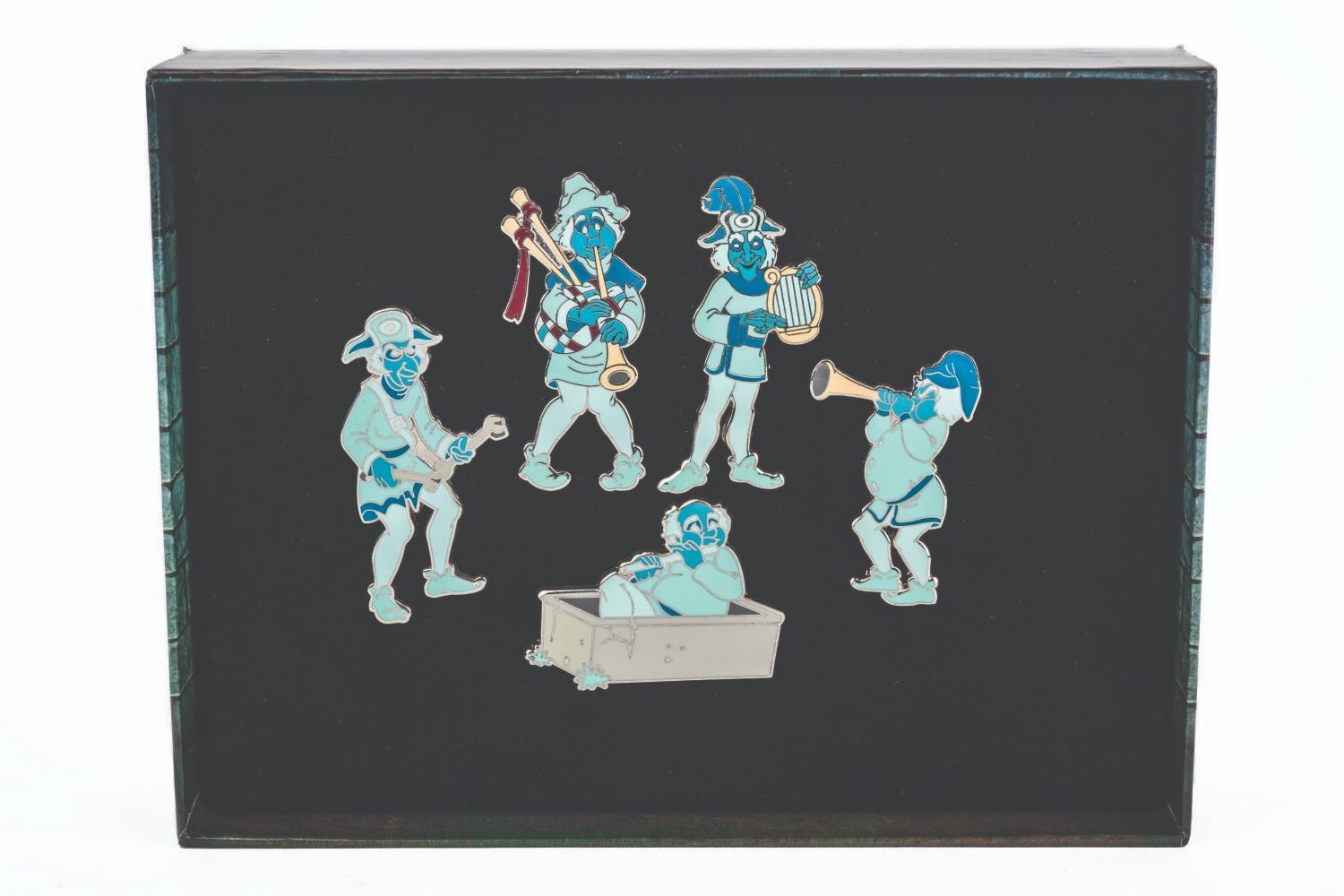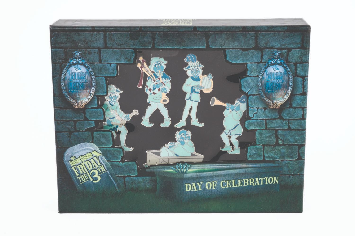 (Walt Disney World, 2008) A Walt Disney World Friday The 13th day of Celebration at The Haunted Mansion limited edition Pin Set. This (5) pin set was limited to an edition of 500 and includes members of the Phantom Five Graveyard Ghost Band from the popular attraction. Each pin is in fine condition in its original collectible window box.