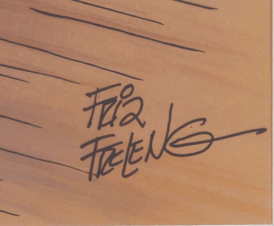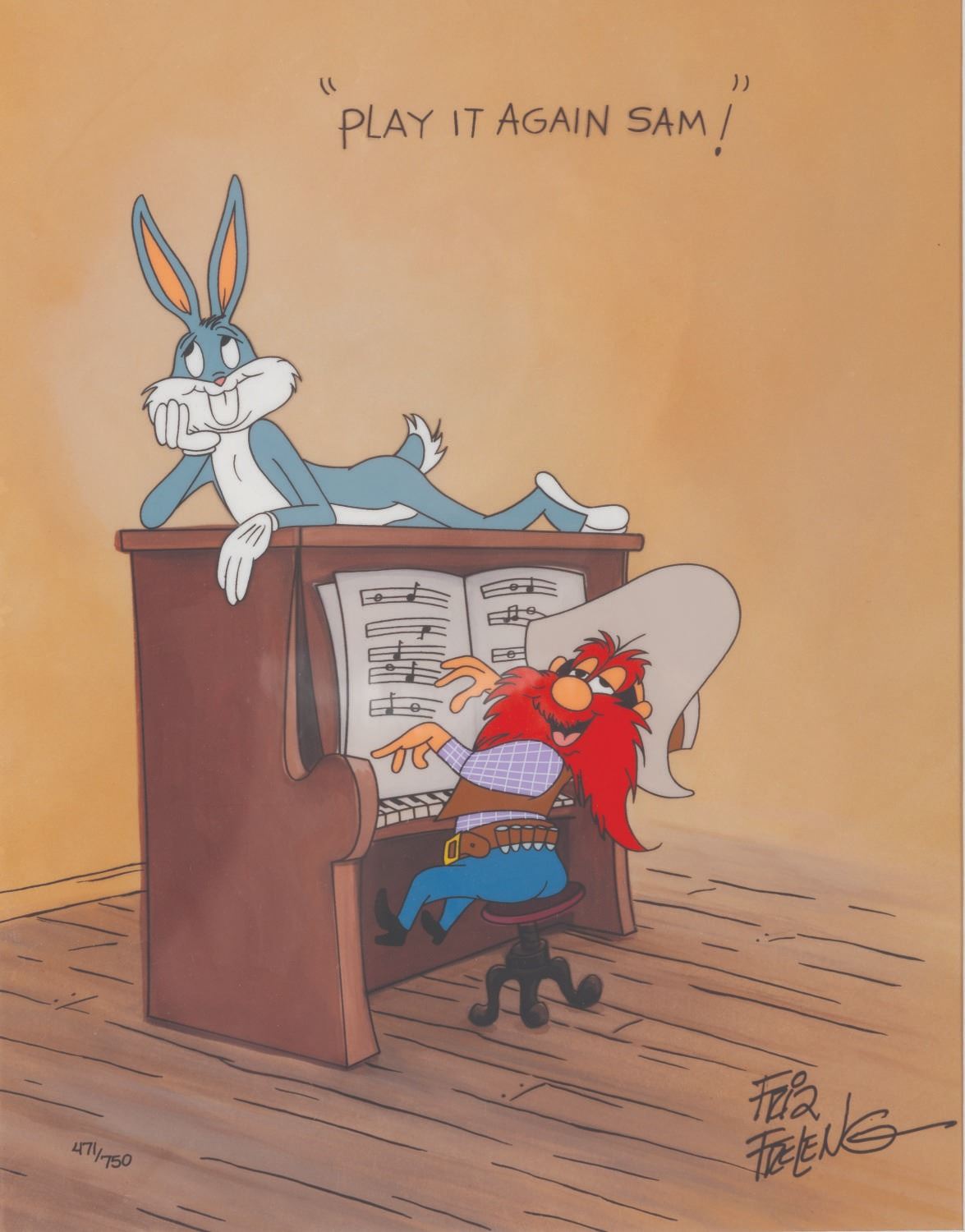 (Warner Bros., 1992) A limited edition cel of Bugs Bunny and Yosemite Sam titled “Play It Again Sam!” signed by Friz Freleng. The hand-painted cel is numbered 471 out of 750 and is paired with a Studio-printed color copy background. Bugs Bunny and Sam have an image size of 6.5” x 9.5” on a 10.5” x 13.5” visible cel. The entire matted piece measures 16” x 20”. The artwork is in fine condition.