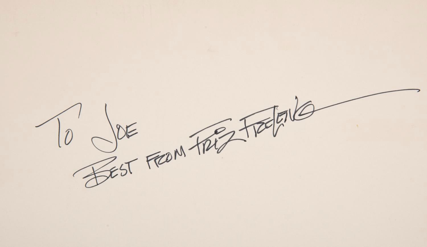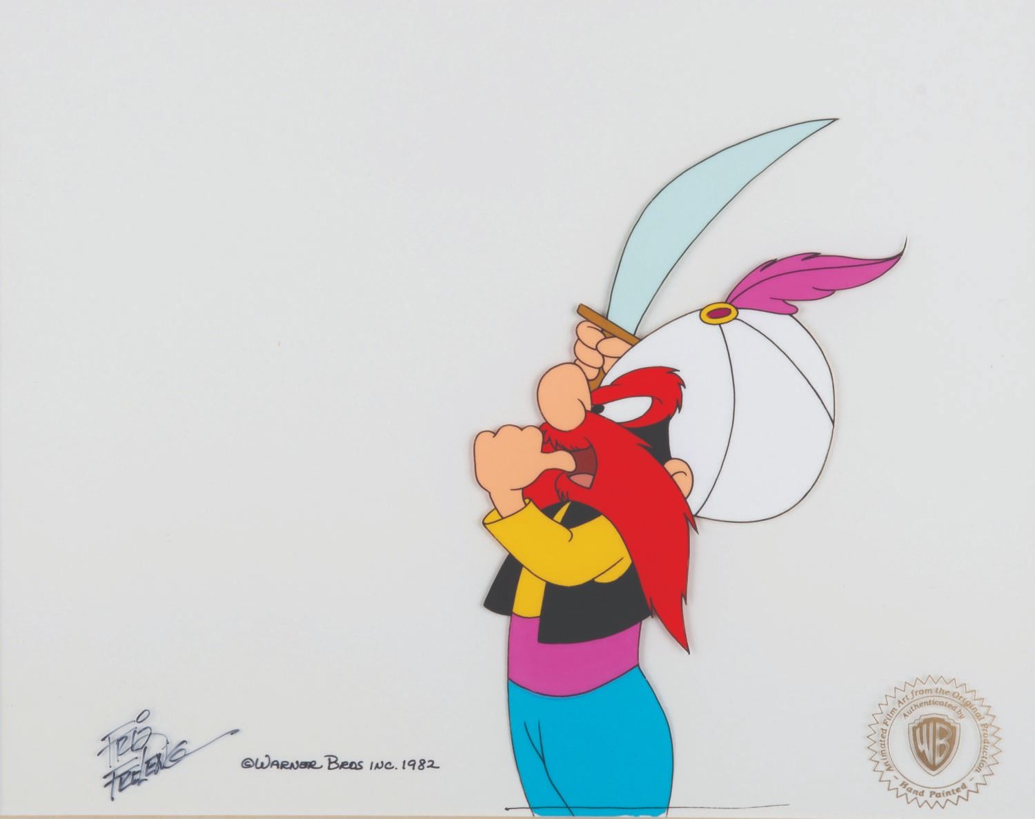 (Warner Bros., 1982) An original production cel of Yosemite Sam from the 1982 feature film,"1001 Rabbit Tales." The cel has been hand-signed by the film's Executive Producer, animation legend Friz Freleng. Sam measures 5"x8.25" on an untrimmed cel in 10"x12" cel. The cel is in fine condition and still in its original frame which has an additional dedication by Freleng on the reverse.