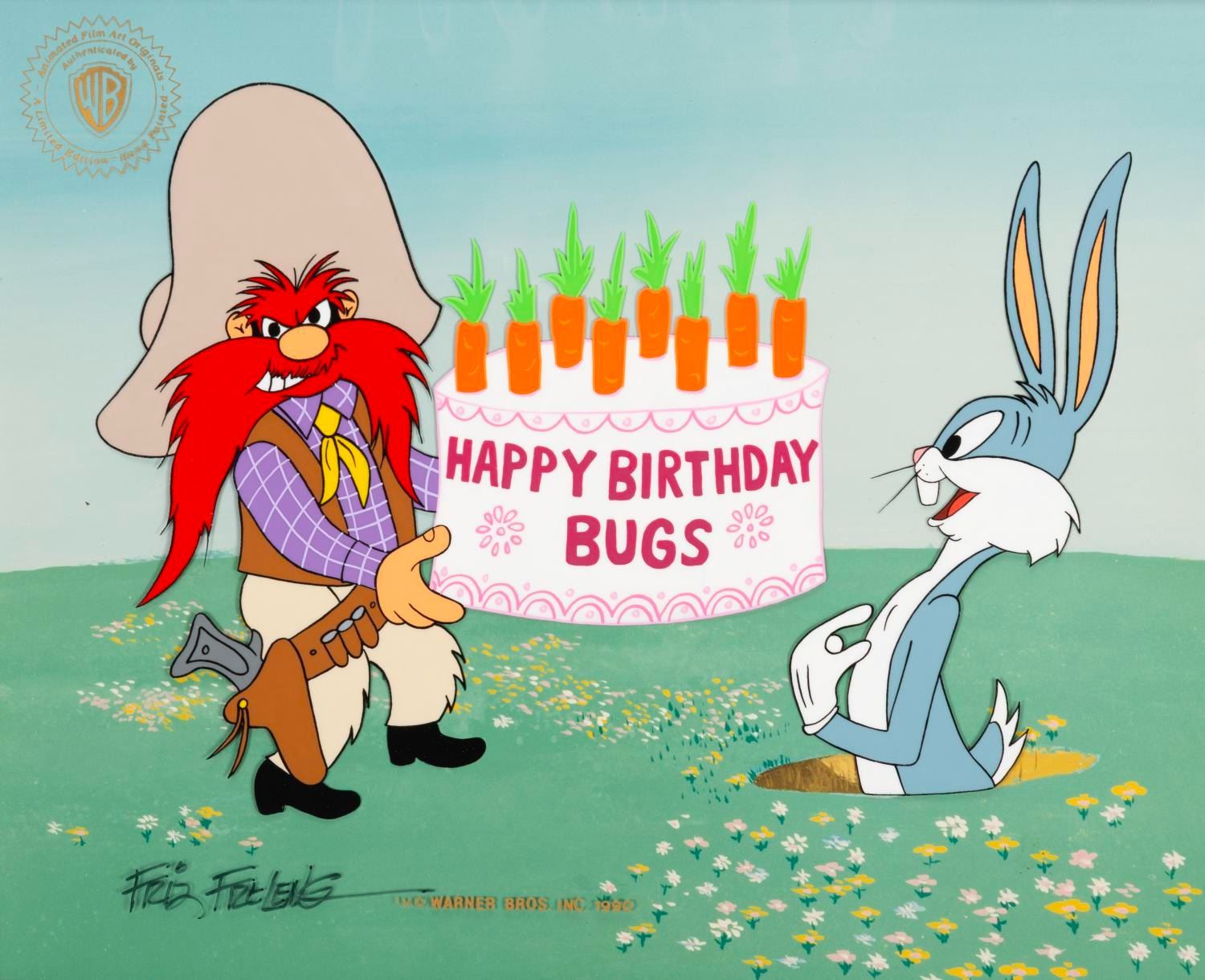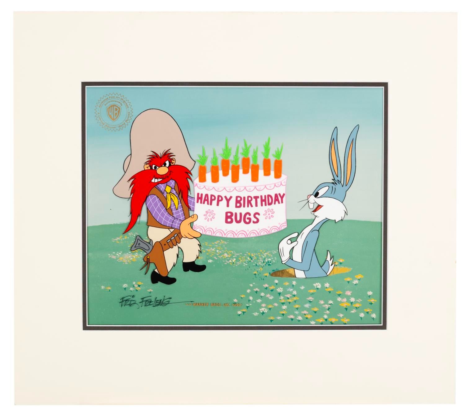 (Warner Bros., 1990) A hand-painted cel of Yosemite Sam and Bugs Bunny titled "The Celebration. " Released in a limited edition of 750, the cel with an image size of 9.5 " x 11.75 " in a 15.75 " x 17.75 " matte is in fine condition.