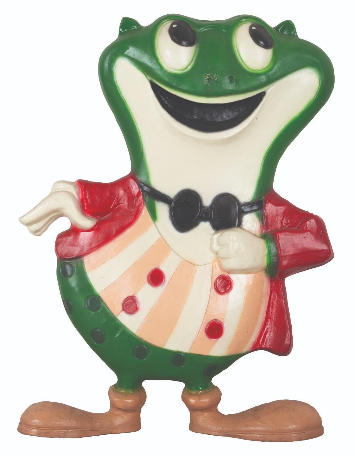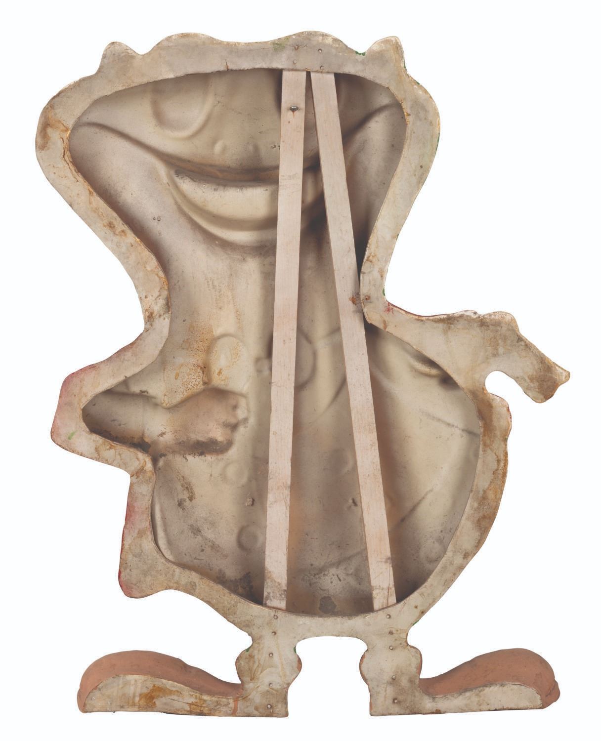 (Buster Brown, 1950s) A Froggy the Gremlin store window display for Buster Brown Shoes. Froggy was a mischievous practical joker on the "Smilin' Ed McConnell's Buster Brown Gang" children's radio show, sponsored by the shoe company. Accomplished in composite with two wooden supports in the back, Froggy measures 26” x 30.5” x 4” deep. The display is in good condition with light cracks to the base of the shoes, neck, and left cuff, light cracks with paint loss along the mouth and bottom edge where the legs meet the shoes, a 1.25” area of cracking with paint loss on the nose, and light soiling and spots of stains throughout.