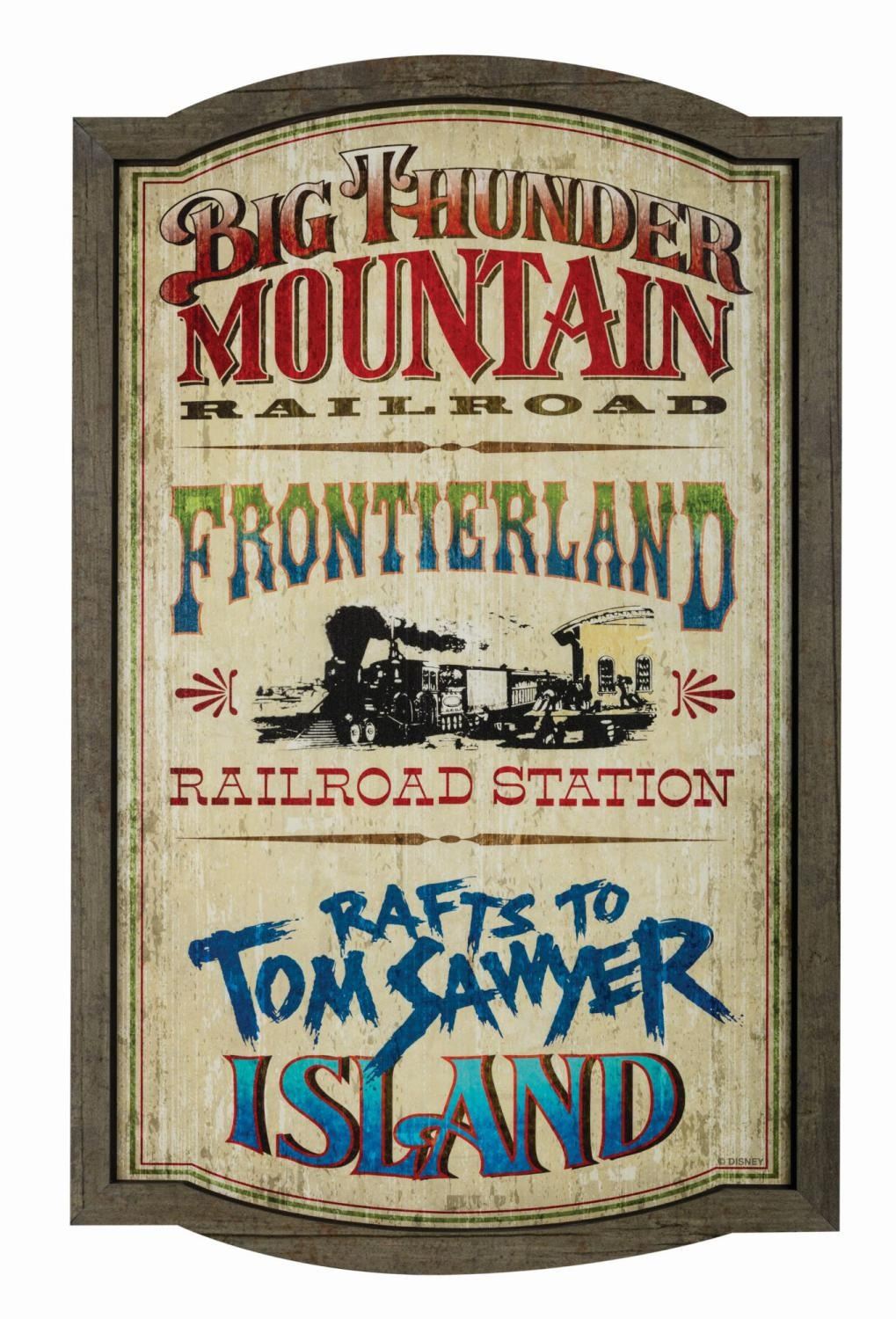 (Walt Disney World, c.2010s) A Magic Kingdom Frontierland attractions Wall Plaque souvenir. Printed in full color on a wood composite backing, the wall plaque promotes such Frontierland adventures as Big Thunder Mountain Railroad, the Frontierland Railroad Station, and the Rafts to Tom Sawyer Island. Measuring approximately 29"x18.5", the piece is in very fine, as-new condition.
