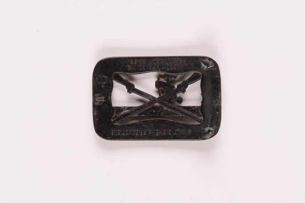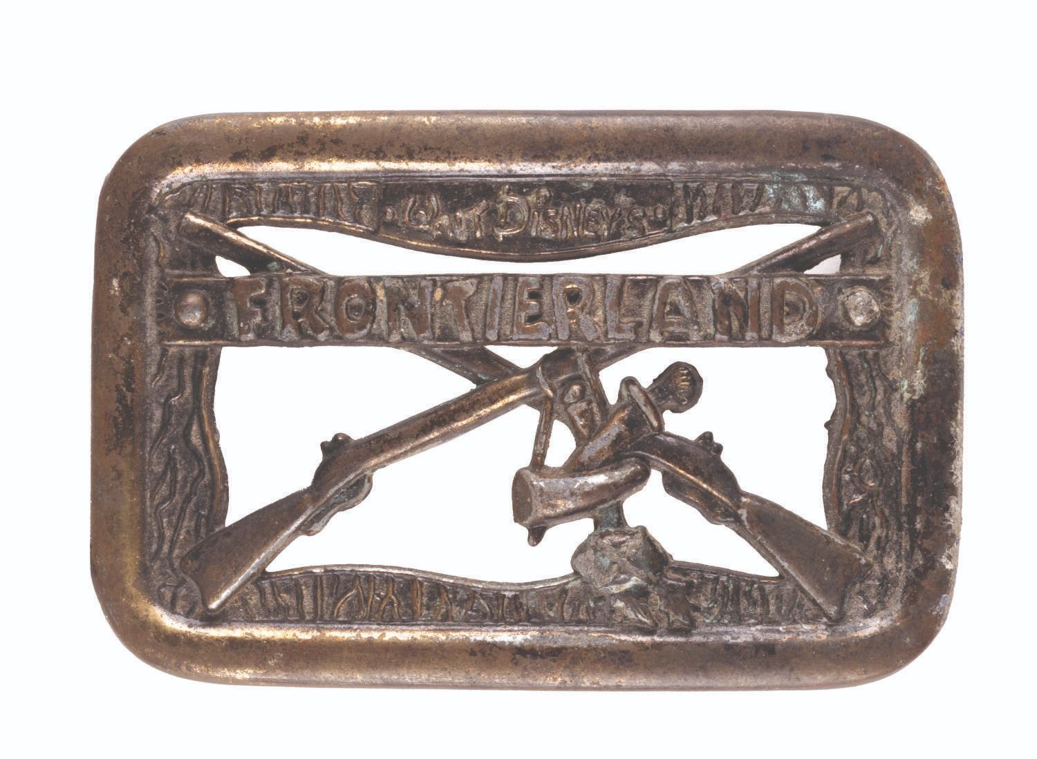 (Disneyland, 1960s-70s) A bronze souvenir belt buckle featuring a pair of crossed muskets by L.M. Eddy, sold in Frontierland. Measuring 3” x 2”, the metal buckle is in fair condition with tarnish, scuffs, and wear throughout.