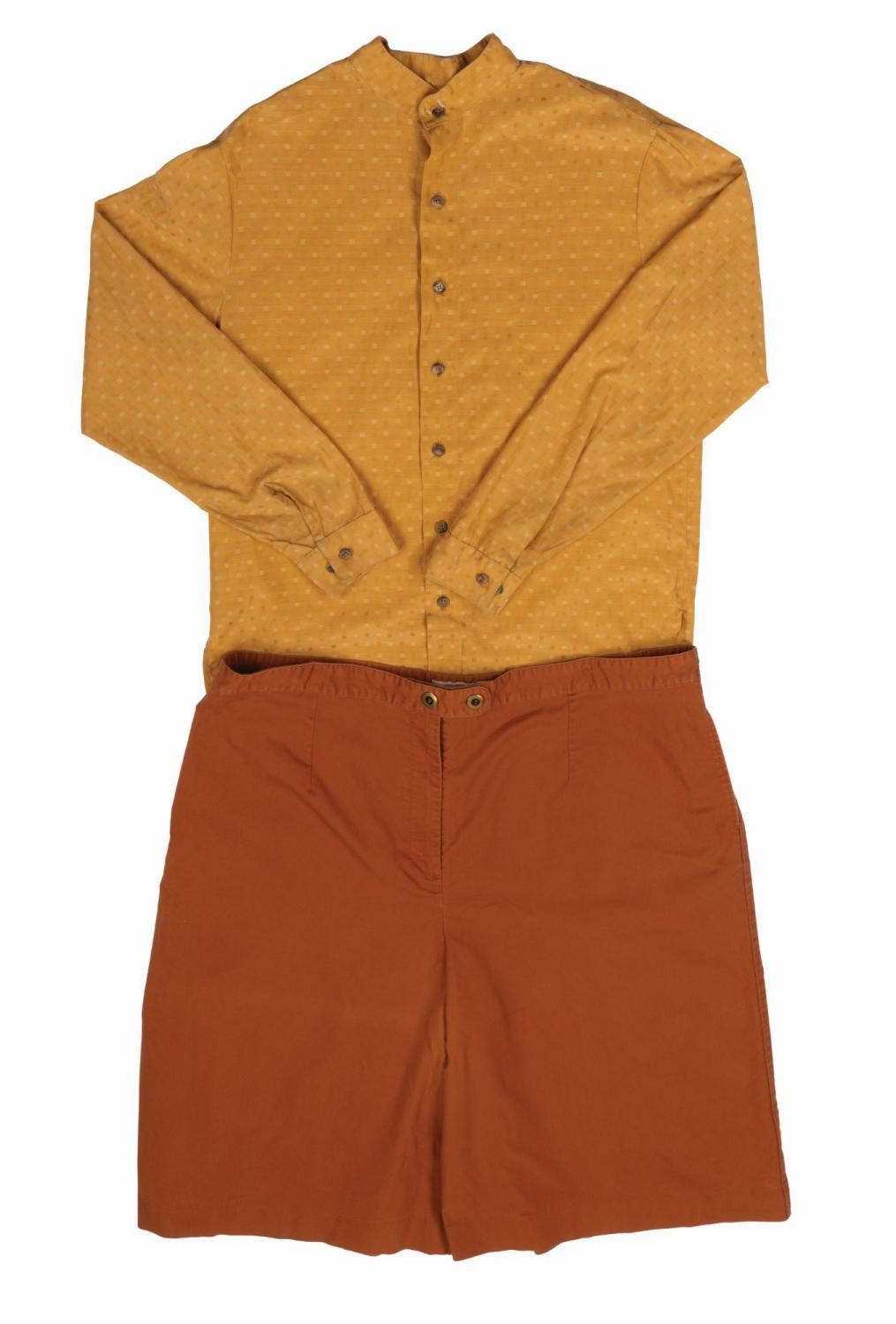 (Walt Disney World) A shirt and dress worn by Cast Members working in Frontierland at the Magic Kingdom. The dress is labeled a size 28x30 and the shirt a female size S. Both garments are in good Park-used condition.