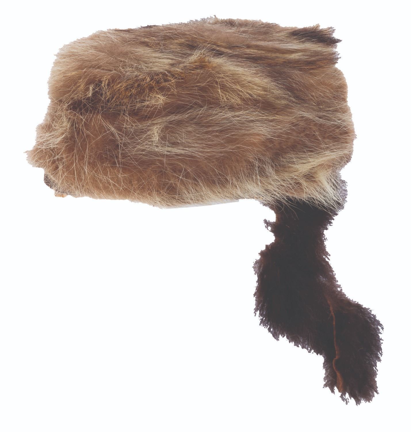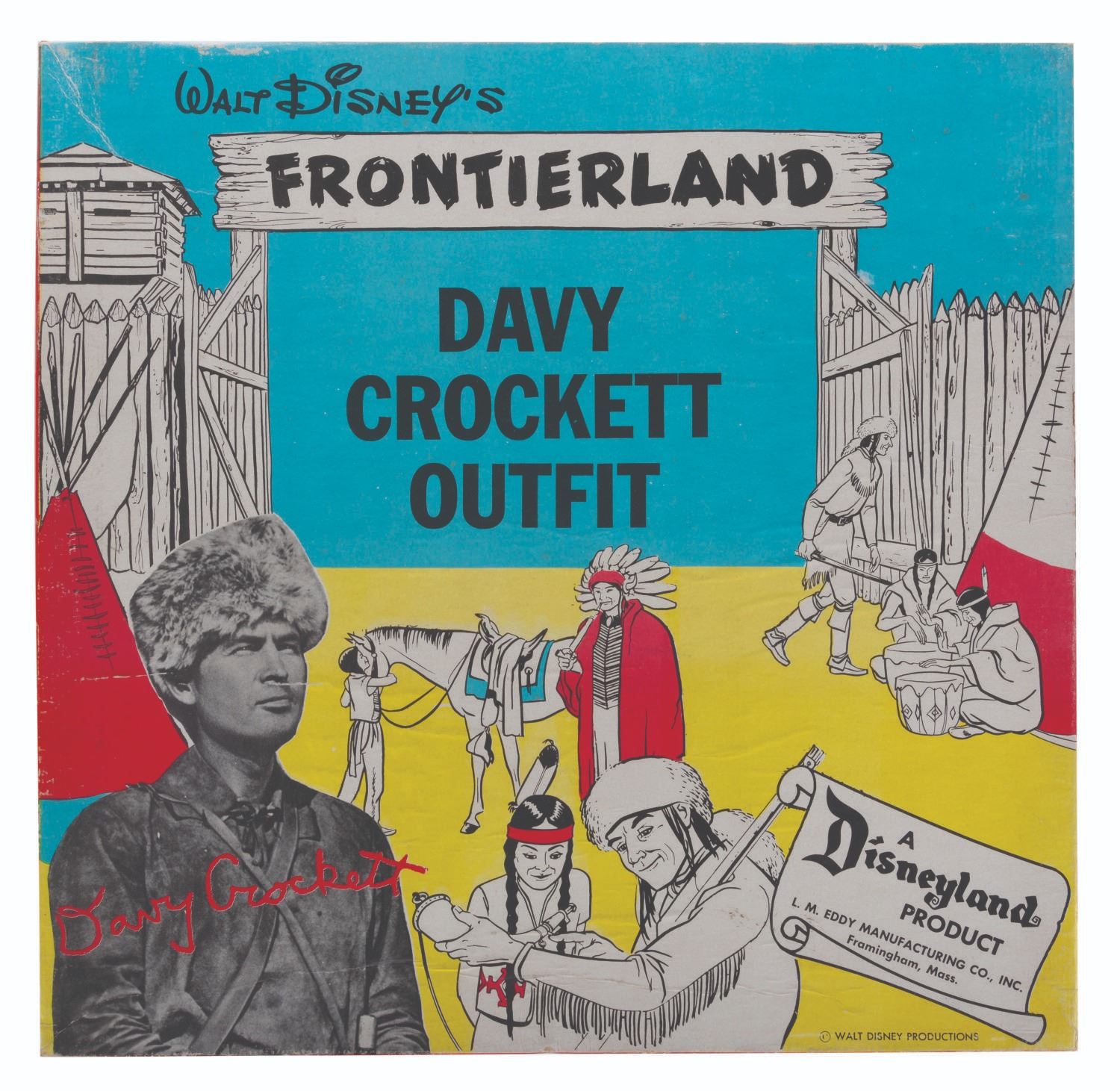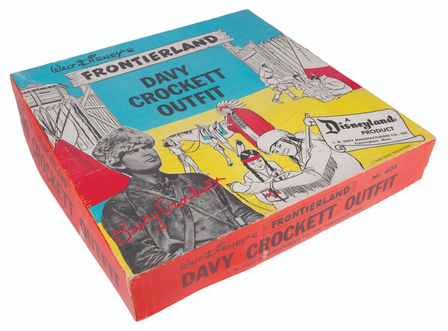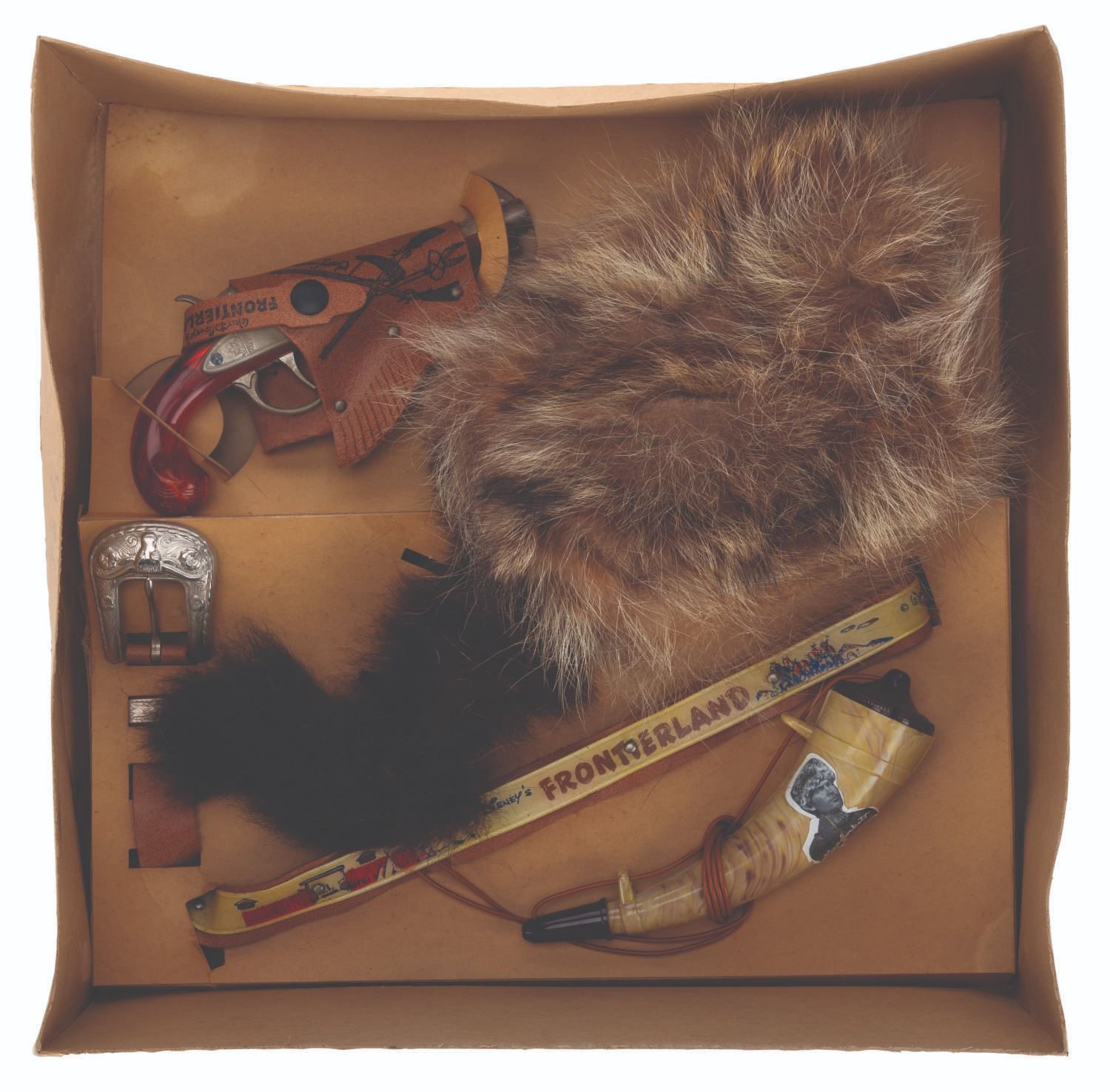 (Disneyland, 1955) A Davy Crockett Outfit playset sold in Frontierland during the early years of the Park. Included in the set are a play gun and holster, a Frontierland belt, a plastic powder horn with Davy Crockett decal, and a coonskin cap. The items are in good-to-very-good condition with some wear due to age, including slight chipping to the decal on the powder horn and stiffness to the belt, but all items appear unused. The box measuring 15" x 15" and 4" deep is in good condition with wear, creases, and slight bubbling to the cover paper.