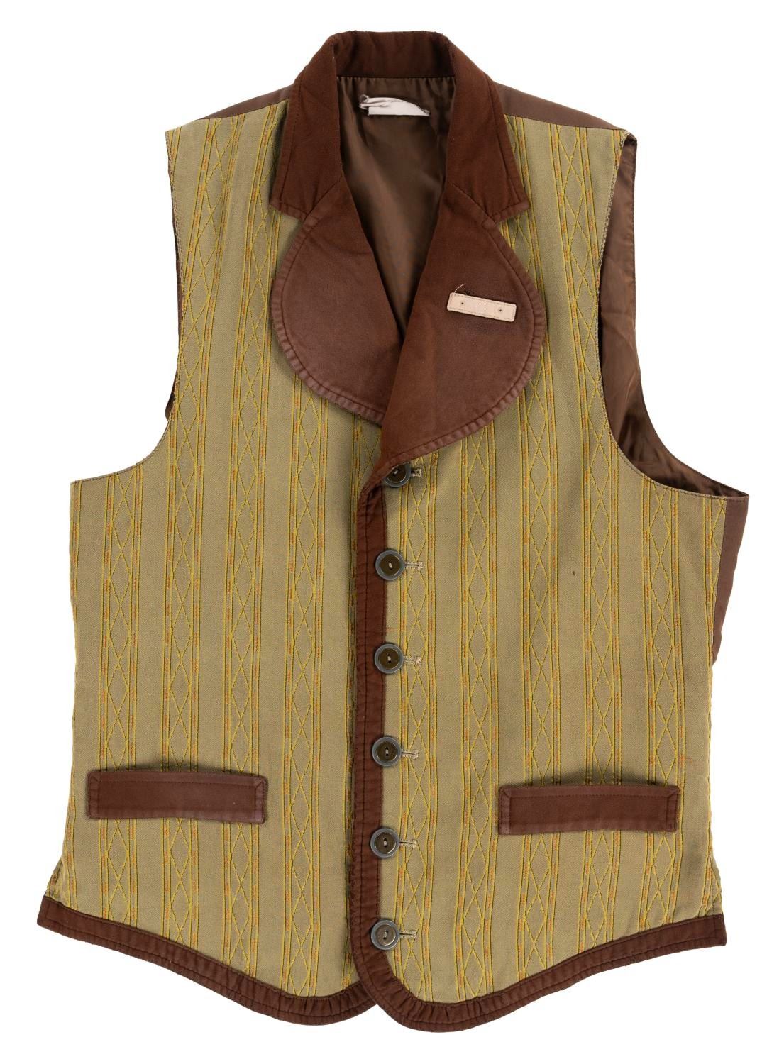 (Walt Disney World, 2000s) A costume vest worn by Cast Members at Frontierland Merchandise locations in the Magic Kingdom. Labeled a male M, the vest is in good condition with discoloration from age and wear from Park use.