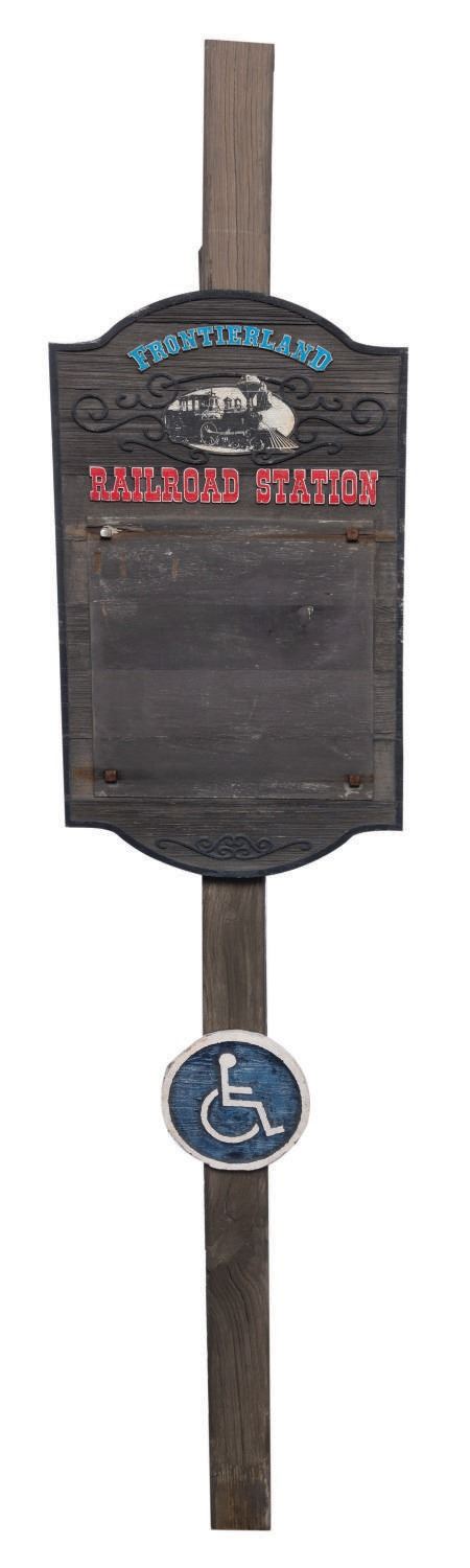 (Walt Disney World, 1980's-1990's) A sign from the exit ramp and disabled access entrance of the Walt Disney World Frontierland Railroad Station. This also served as a lamppost, with a heavy electric cable running through to light the fixture above. The sign measuring 17.5"x30.5" is in good condition, with weathering and wear typical of Park use, and (1) of the spikes that held the information plaque replaced. The post measuring 83.5"x5"x3.5" is also in good Park weathered condition with expected wear.