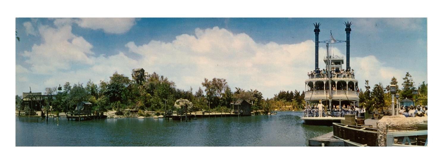 (Disneyland, 1950s) A panorama postcard capturing an early view of the Mark Twain circumnavigating the Rivers of America around Tom Sawyer Island in Frontierland. Measuring 11"x3.5", this postcard is in good condition with scuffs and spots of discoloration on the back and wear to its edges and corners.