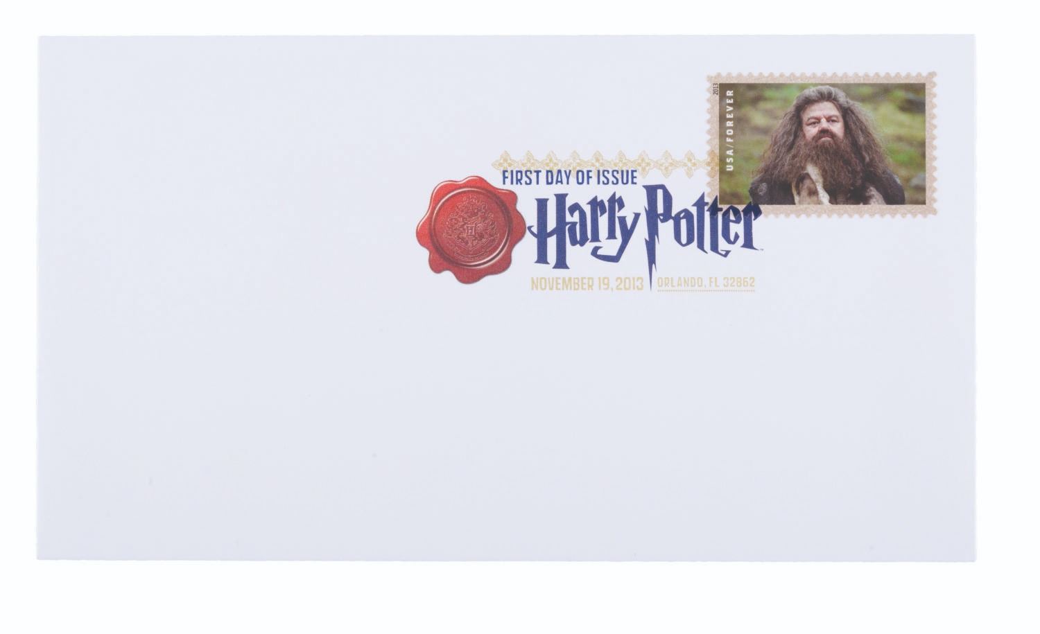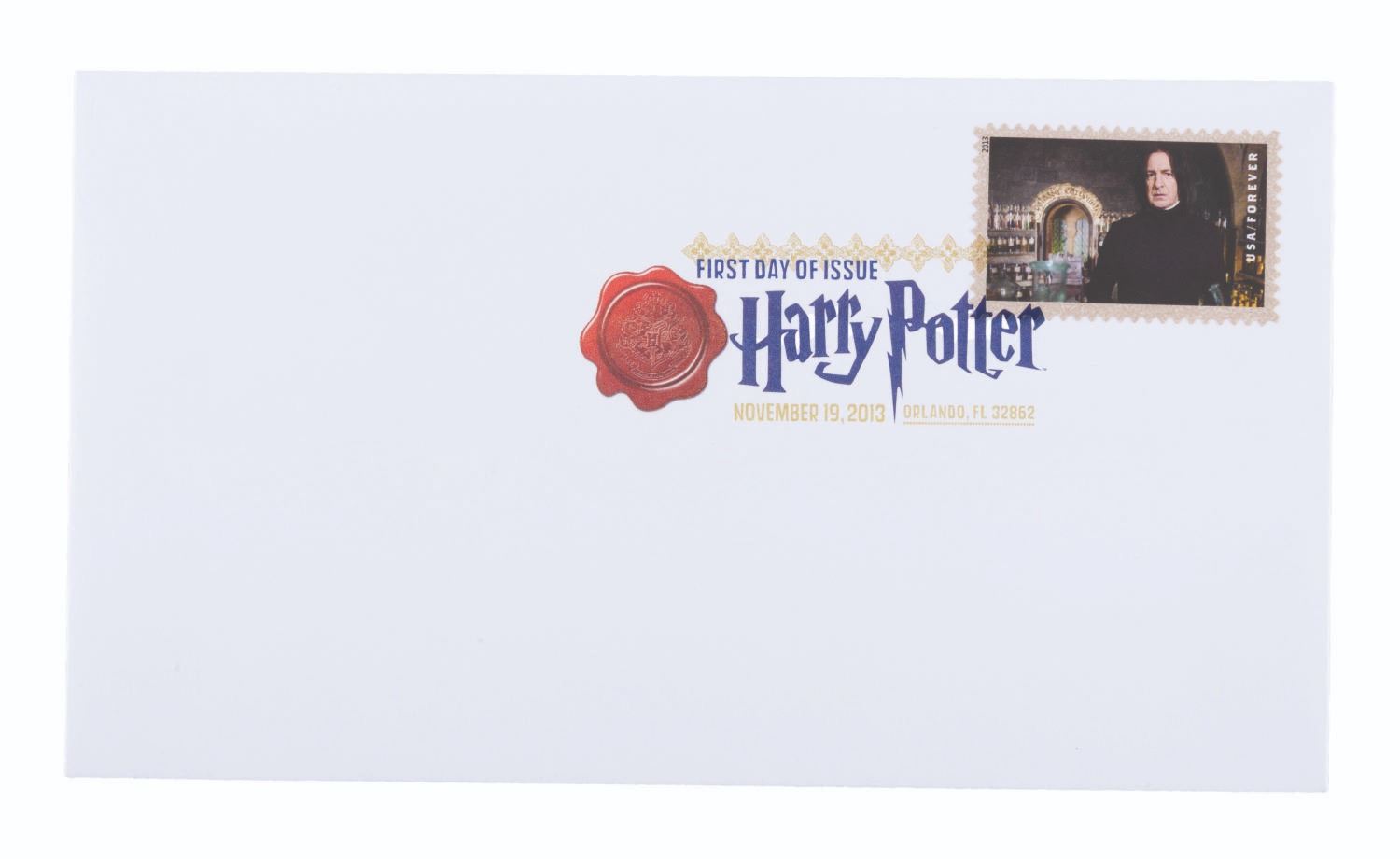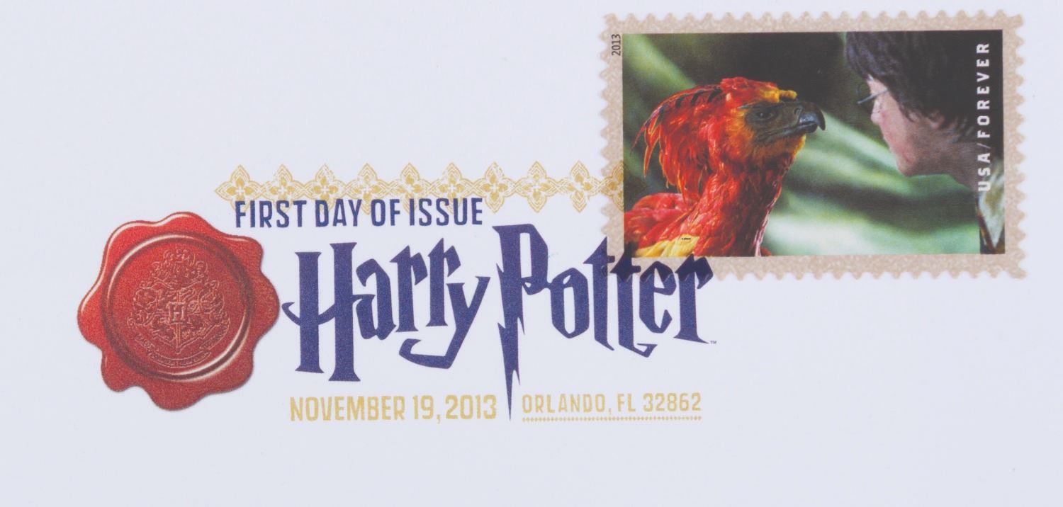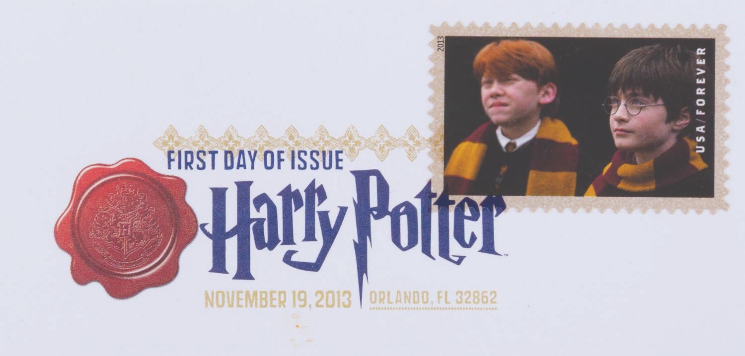 (US Postal Service, 2013) A complete set of 20 Harry Potter Forever stamps, canceled on the first day of issue, November 19, 2013. The stamps were announced at the Wizarding World of Harry Potter, Universal Studios, where they were issued. The stamped envelopes are in very good to fine condition, some with very light handling wear.