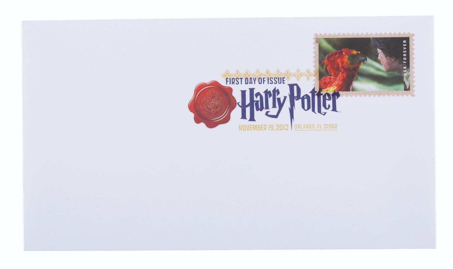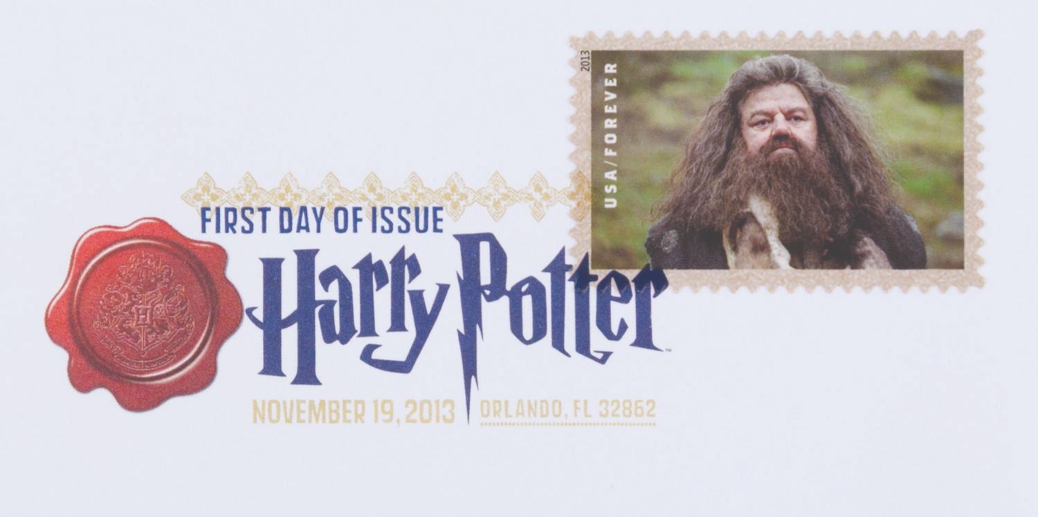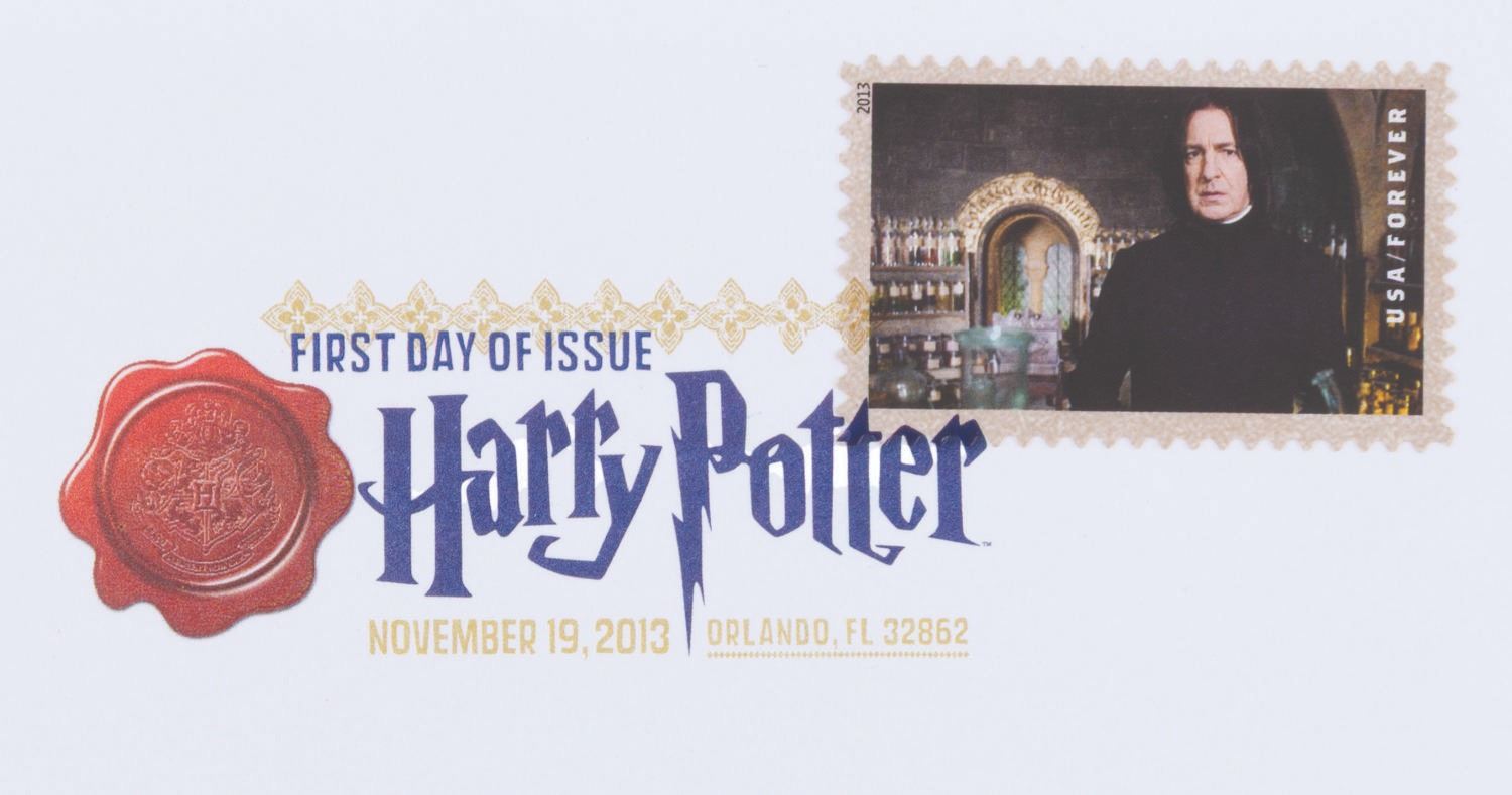 (US Postal Service, 2013) A complete set of 20 Harry Potter Forever stamps, canceled on the first day of issue, November 19, 2013. The stamps were announced at the Wizarding World of Harry Potter, Universal Studios, where they were issued. The stamped envelopes are in very good to fine condition, some with very light handling wear.