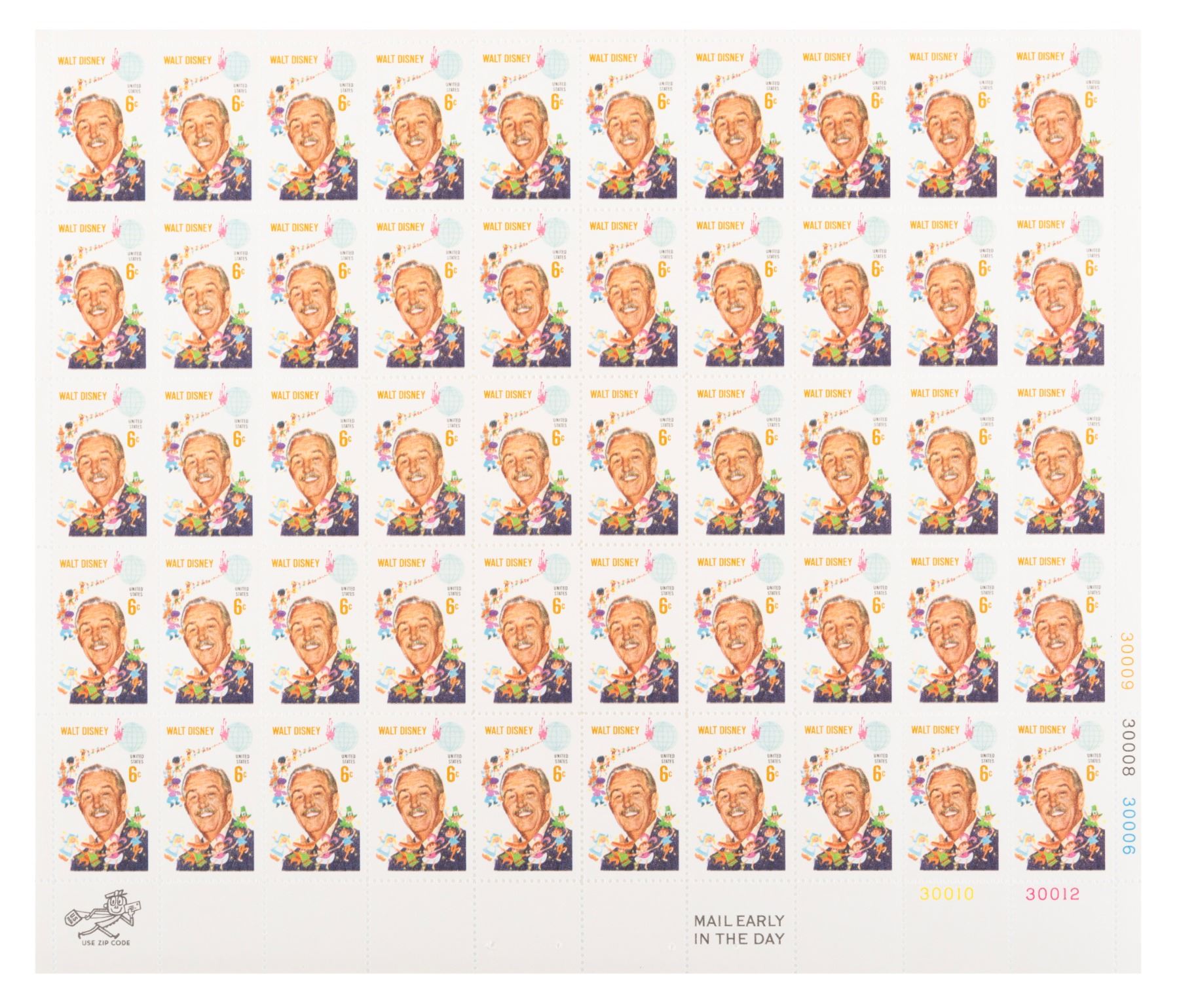 (USPS, 1968) A complete sheet of 50 unused Walt Disney stamps from the United States Postal Service. Measuring 9” x 10.25”, the sheet is in very good condition with pinholes on the border which do not affect the actual stamps.