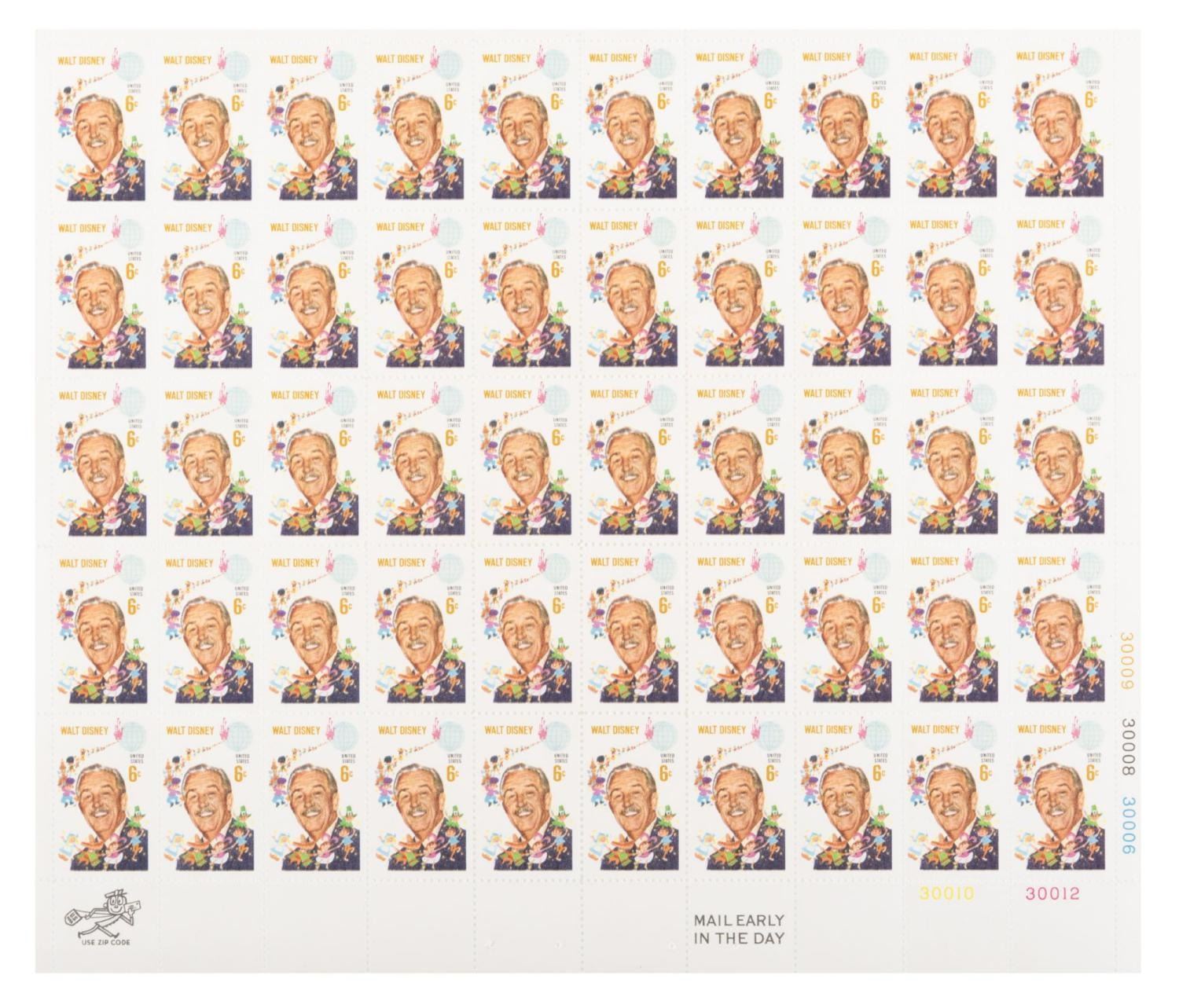(USPS, 1968) A complete sheet of 50 unused Walt Disney stamps from the United States Postal Service. Measuring 9" x 10.25", the sheet is in very good condition with pinholes on the border which do not affect the actual stamps.