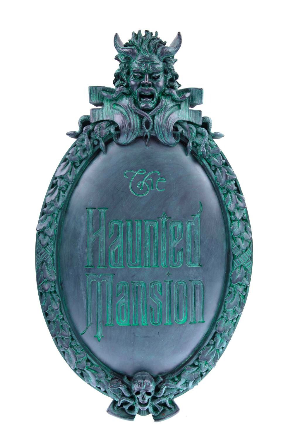 (Disney Parks, 2000s) A Disney Parks Haunted Mansion "Decorative Souvenir Sign" that reproduces the infamous gate plaque from the attraction. Measuring 22.5" x 13"x 2.5", the sign displays in very good condition. The velvet backing has been reattached to the piece, not affecting display.
