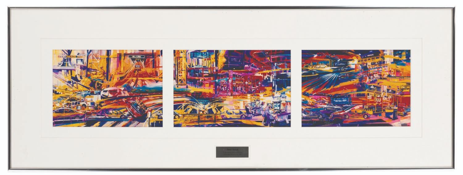 (Epcot, 1999) A print set of the three Test Track Murals painted for the General Motors Pavilion at Epcot’s Future World. Each print is signed and numbered 76/500 by the artist Tony J. Warren. Measuring 14.75" x 40.25" framed overall, with matte openings of 6.75" x 10.5" each, the piece displays in fine condition with small bits of debris under the plexiglass.