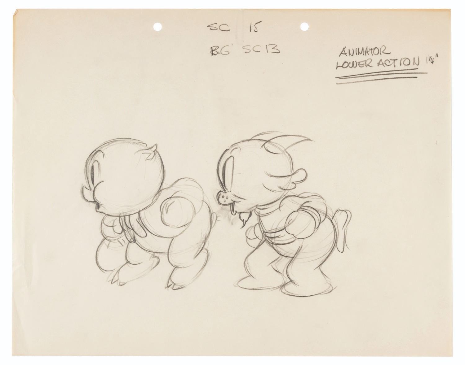 (Schlesinger, 1937) An original production drawing from the Looney Tunes short “Get Rich Quick Porky” directed by Bob Clampett. The drawing, possibly by Iwerks, features Porky Pig and Gabby Goat in his third and final theatrical appearance. Accomplished in graphite and measuring 9.5” x 12” with a character image size of 4.5” x 7.5” the drawing is in very good production-used condition with light discoloration and light creasing and edge wear from production use.