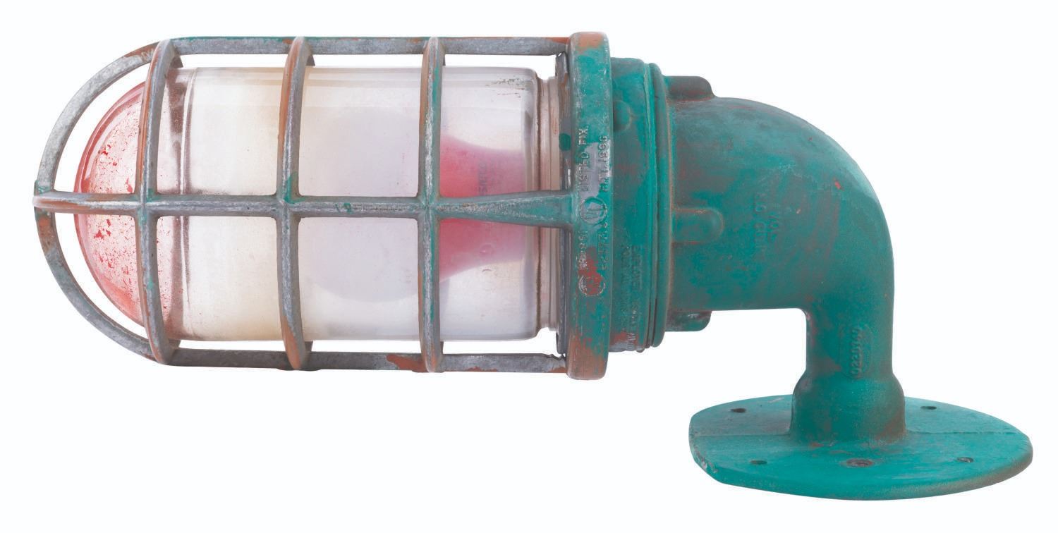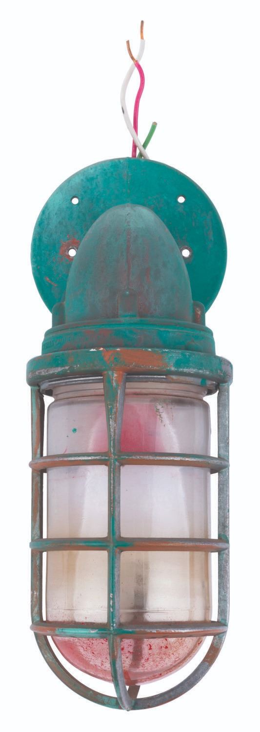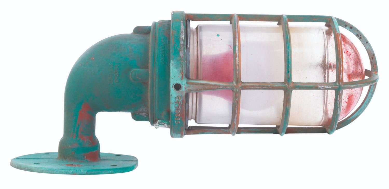 (Disneyland, 1993-2020) A light fixture from the Gag Factory store in Mickey's Toontown at Disneyland. This industrial-style light is painted with the old iron verdigris and rust look that was prevalent throughout the store. Measuring 12.5"x5.5"x4.5", the fixture is in very good Park-used condition.