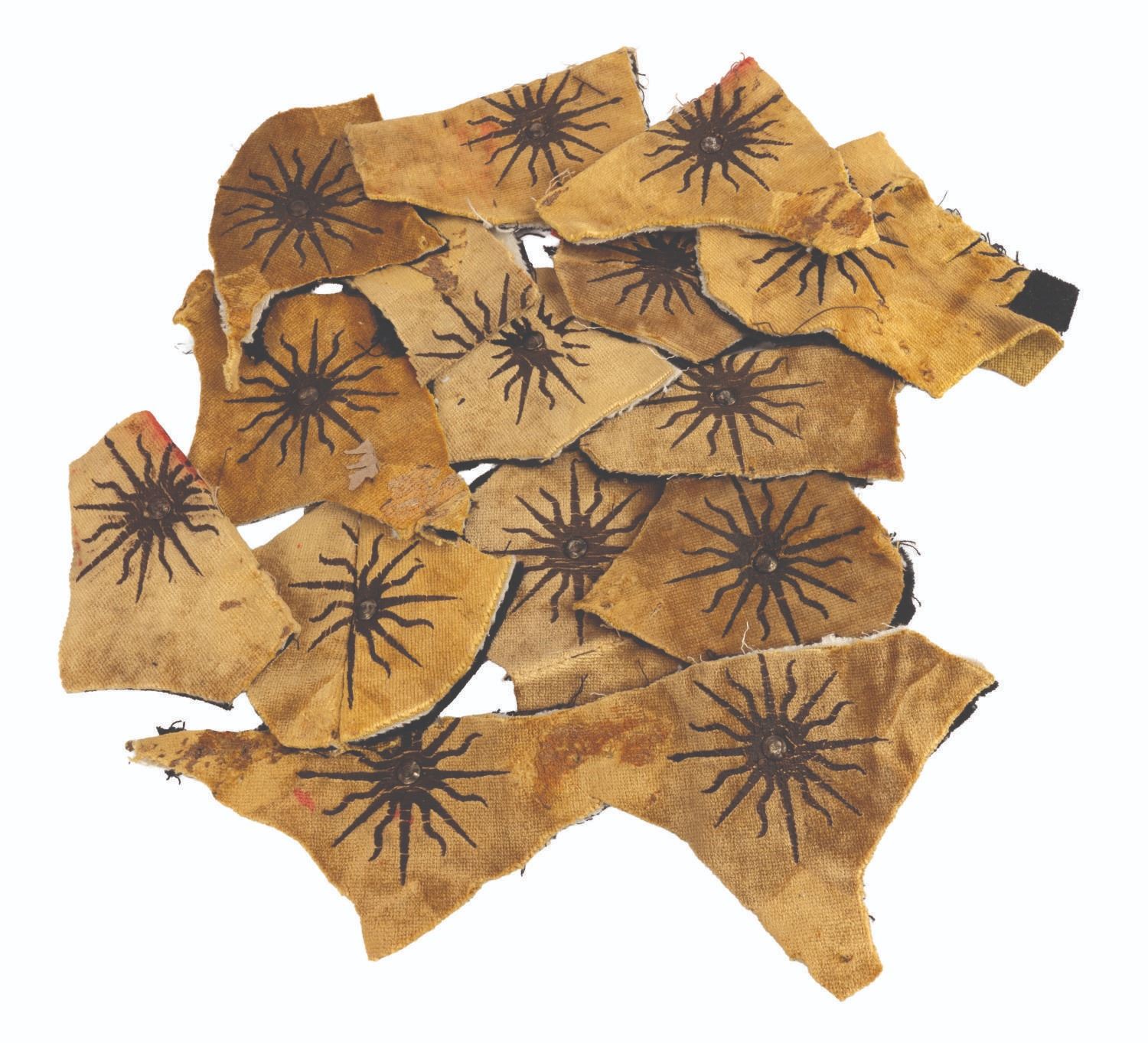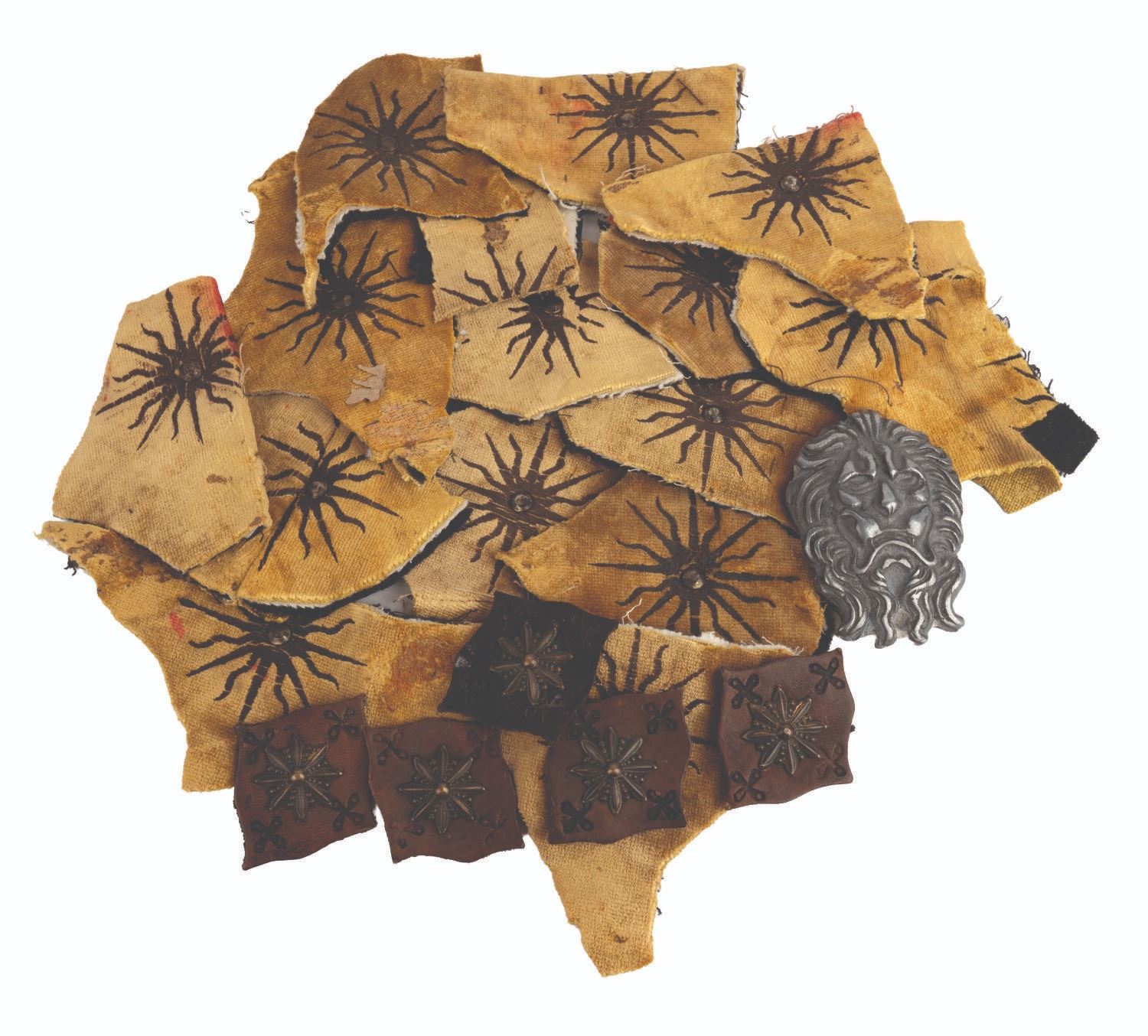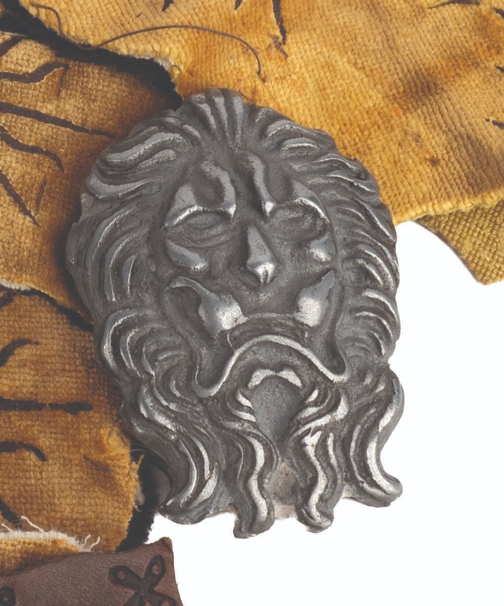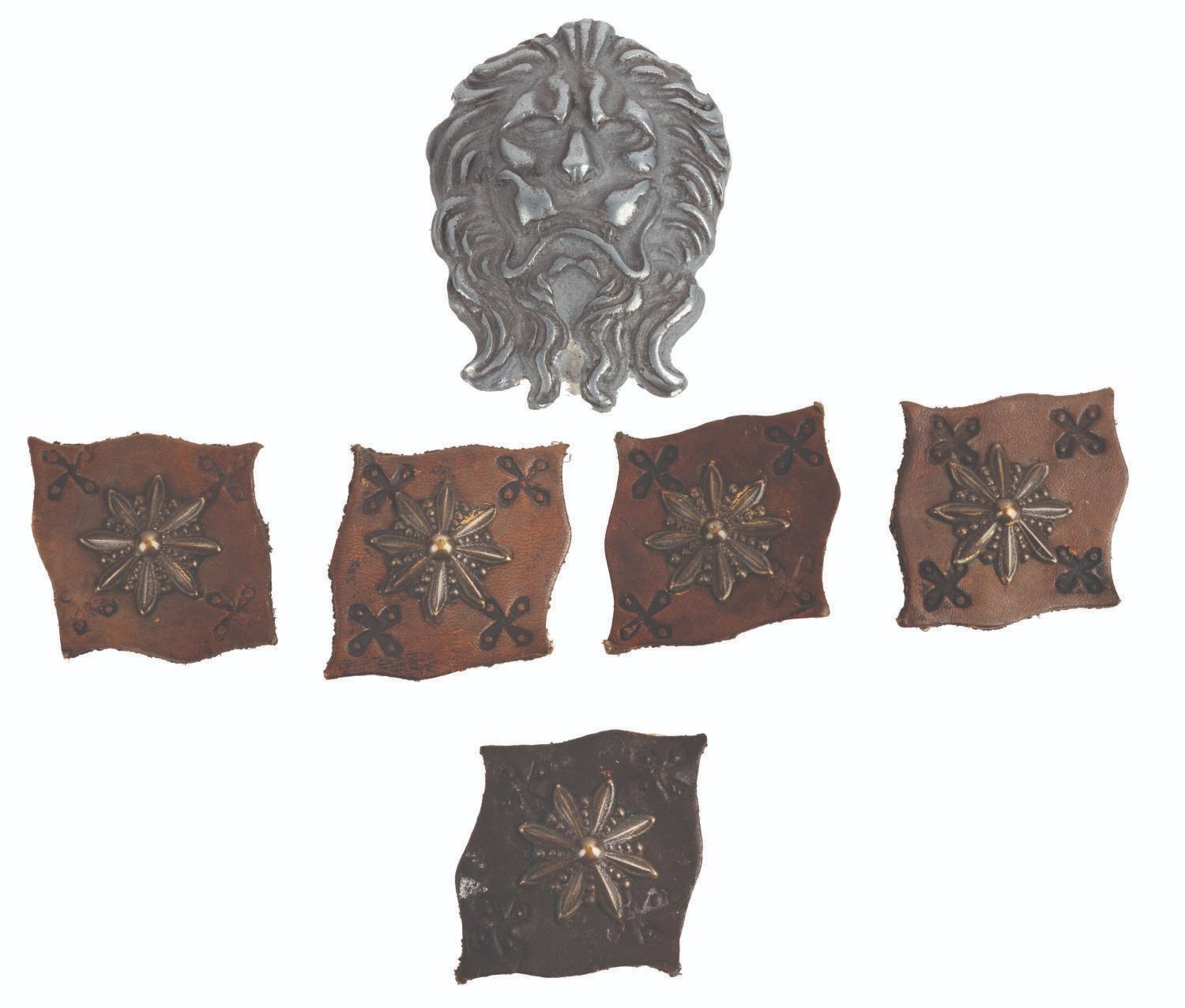 (HBO, 2011-2019) A "Game of Thrones" House Lannister lion armor prop and 15 swatches for the Dornish Guard uniforms, protectors of House Martell. 13 of the swatches are well-maintained, while 2 are in pieces. Ranging in size from the 2" x 2.75" aluminum armor ornament to the 3" x 4" swatches, the costume props are in good to very good condition with typical wear from production use, including soiling, fraying, and material loss.