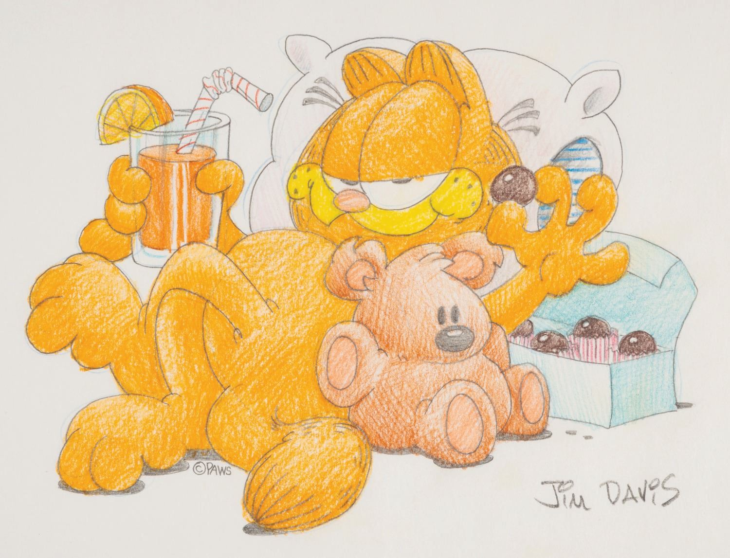 (Davis, 1980s-90s) An original drawing of Garfield by Jim Davis. Davis has been drawing the lasagna-loving, Monday-hating cat for almost 50 years, with the popularity of his comic strip leading to television shows, video games, and movies. With an image size of 5.5” x 7.25” on 10.5” x 12.5” animation paper, the graphite and color pencil drawing is in very good condition, with an embossed Jim Davis Original Animation mark at the bottom left and light creases.