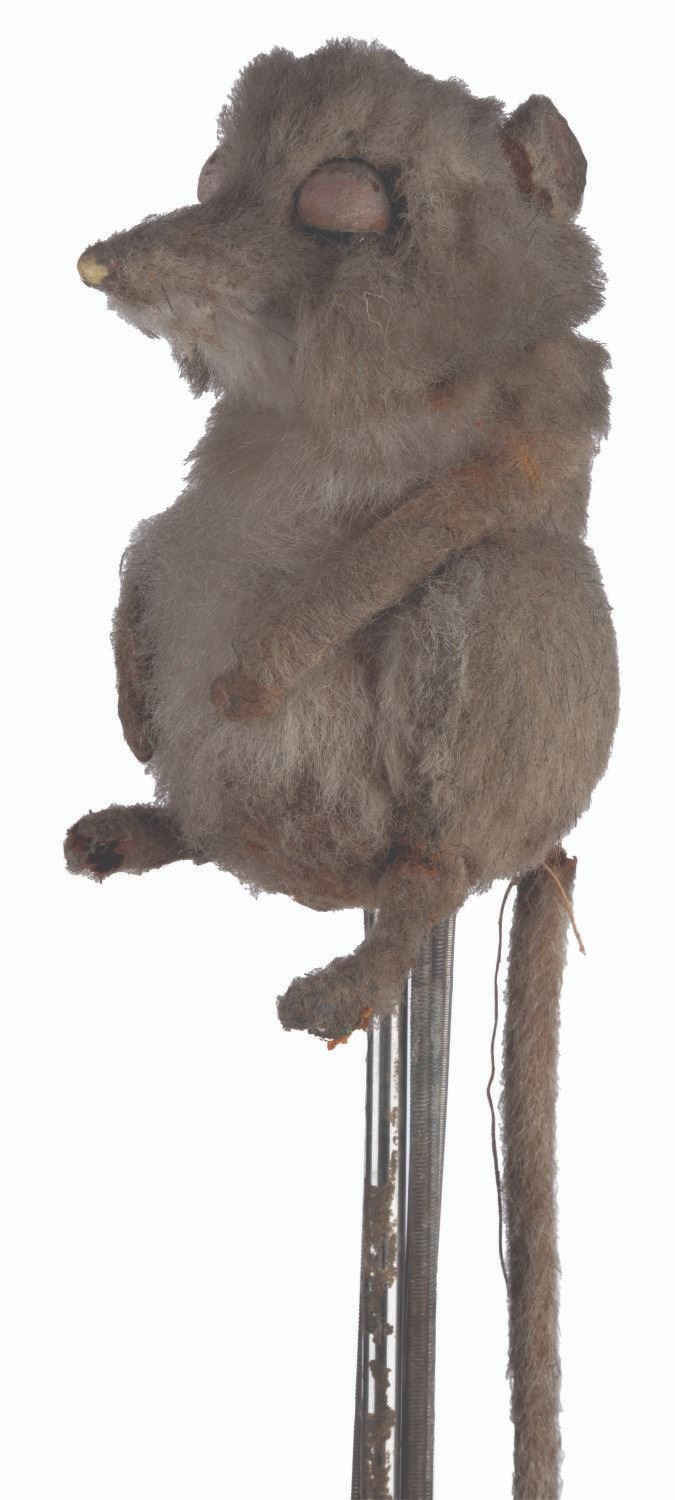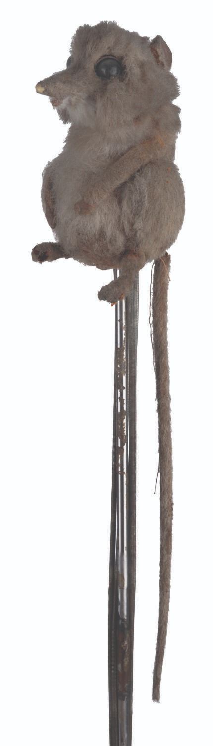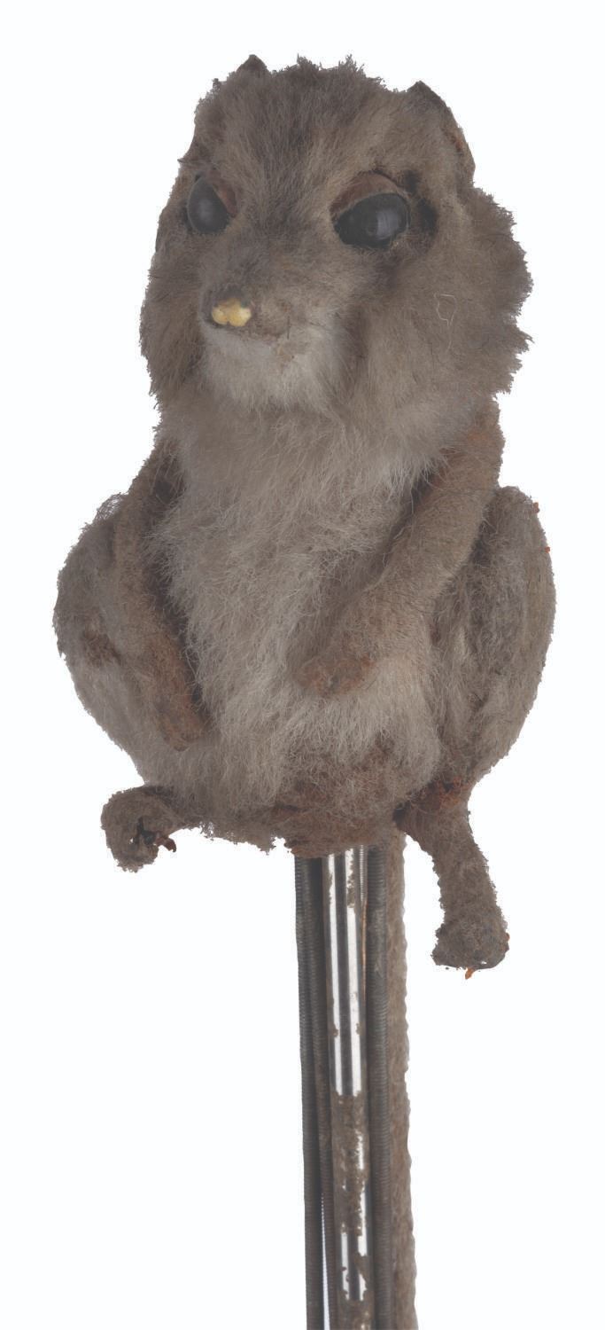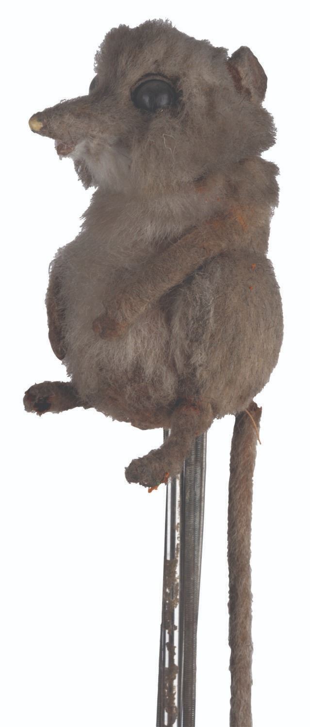 (National Geographic, 1994-1995) An original Sunny Honey Possum puppet from the National Geographic video series “Geo Kids.” Created by Hank Saroyan of "Muppet Babies," the preschool show featured Sunny, Bobby Bushbaby, and Uncle Balzac the Chameleon, who taught children about animals in a magical forest. The armature puppet covered in foam and fur has two separate handles for the blinking eyes and the mouth, both of which worked when tested. Measuring 5” tall with a total height of 33” including the control bar, the puppet displays in good condition with wear from production use, including material loss, separation at the tail, and discoloration from age.