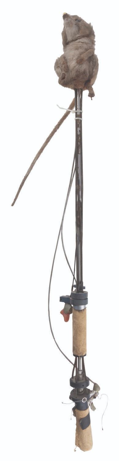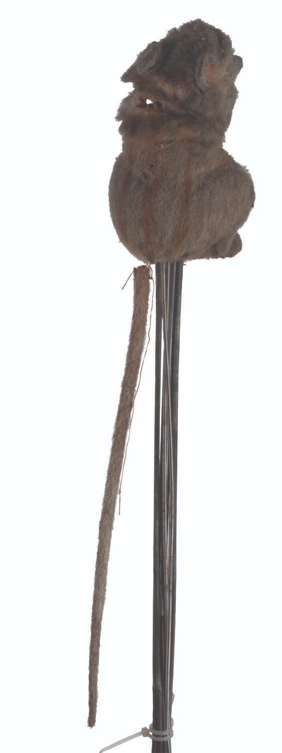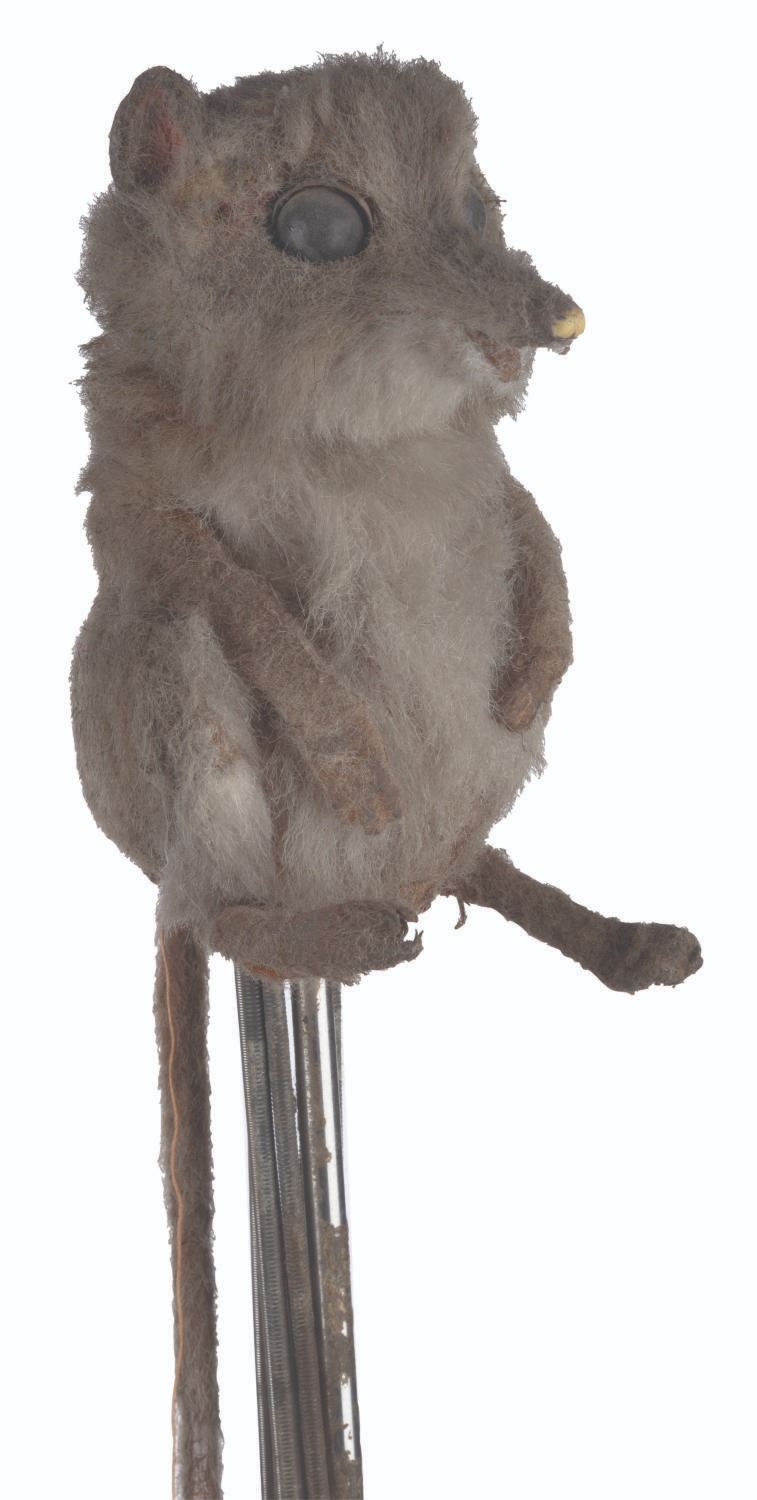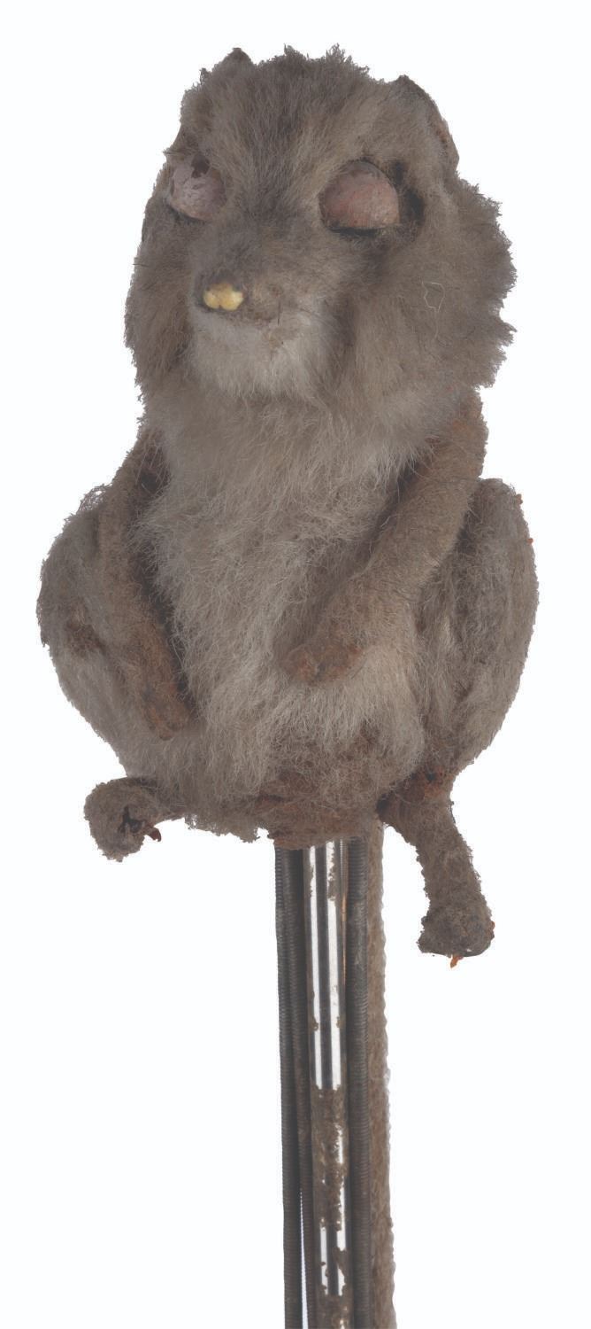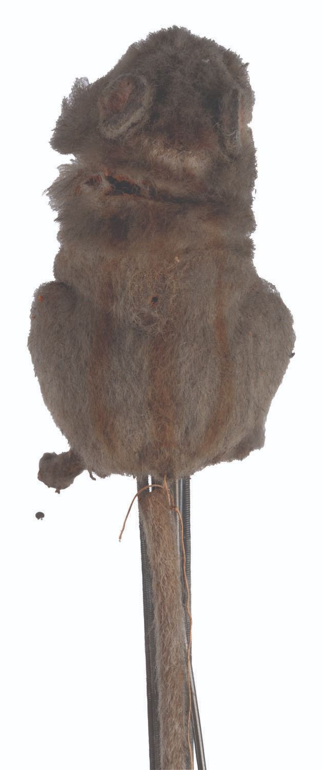 (National Geographic, 1994-1995) An original Sunny Honey Possum puppet from the National Geographic video series “Geo Kids.” Created by Hank Saroyan of "Muppet Babies," the preschool show featured Sunny, Bobby Bushbaby, and Uncle Balzac the Chameleon, who taught children about animals in a magical forest. The armature puppet covered in foam and fur has two separate handles for the blinking eyes and the mouth, both of which worked when tested. Measuring 5” tall with a total height of 33” including the control bar, the puppet displays in good condition with wear from production use, including material loss, separation at the tail, and discoloration from age.