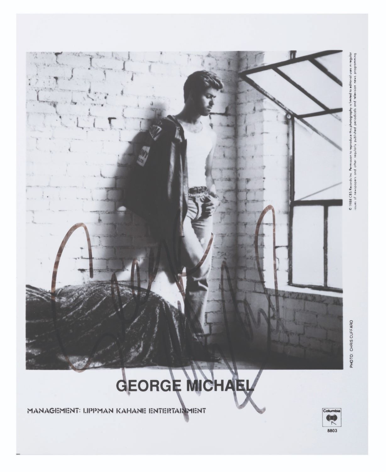 (CBS Records, 1980) A very rare hand-signed photo of George Michael. The iconic musician and founding member of the band Wham! signed this publicity card with a felt pen in large script. Measuring 8" x 10", the photo is in good condition with minor wear, including some slight fading to the signature.
