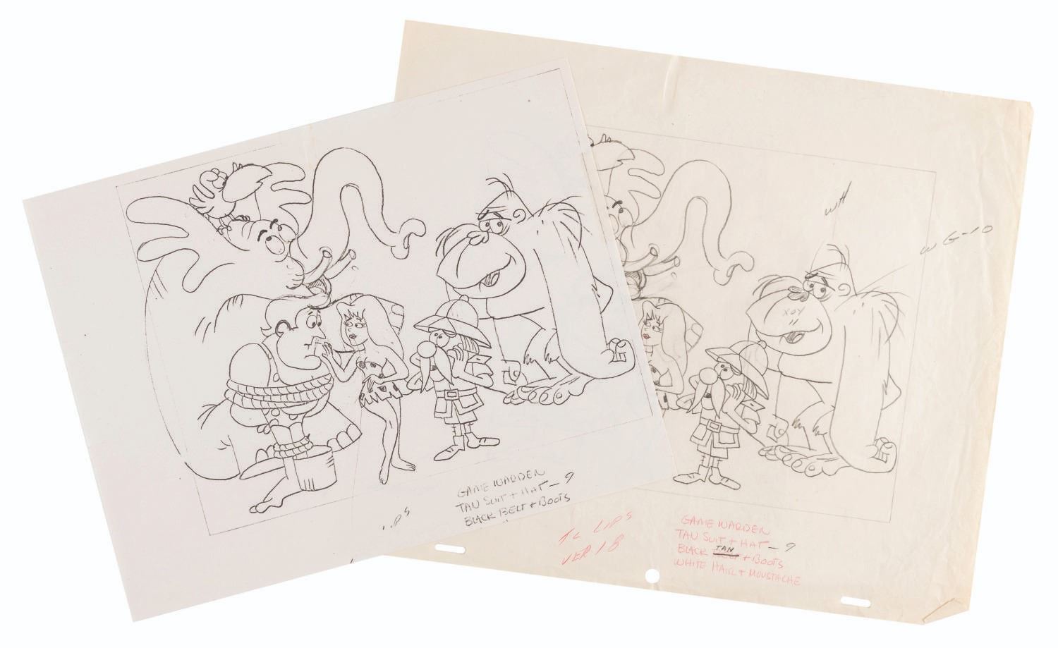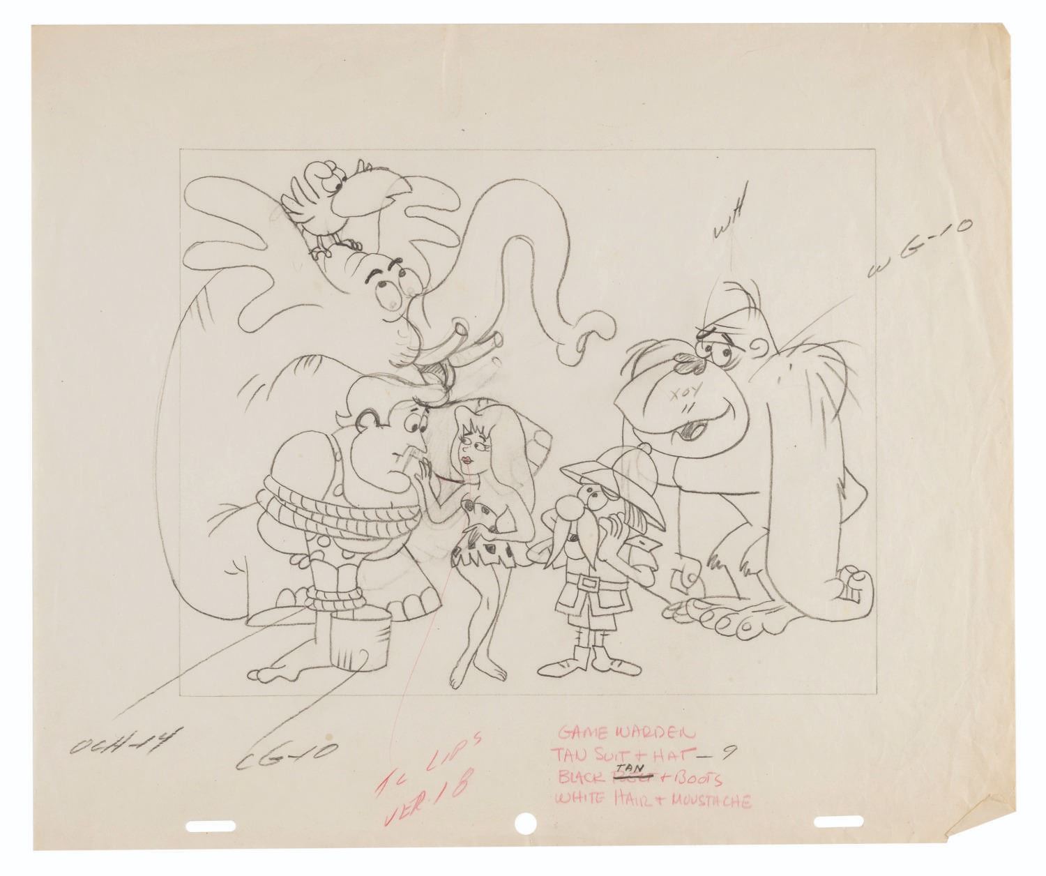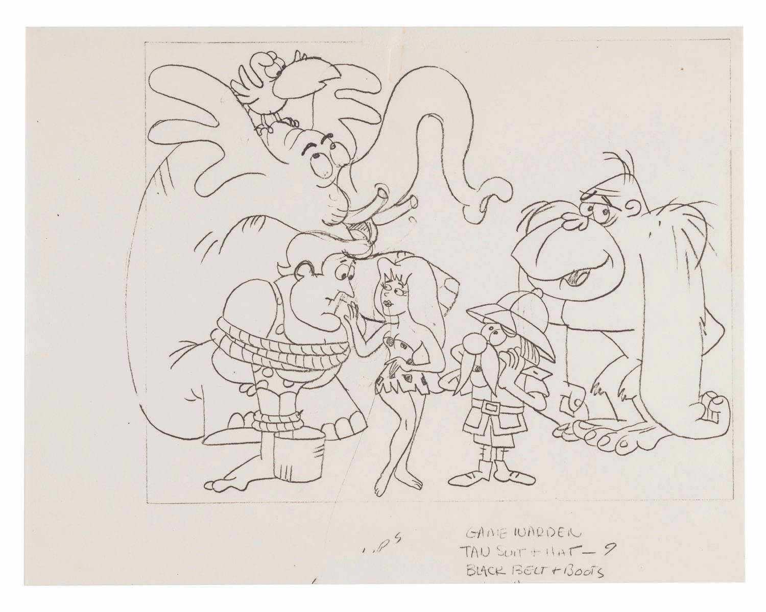 (Ward, 1967) A production layout drawing from “George of the Jungle” featuring the main cast with a Game Warden. Accomplished in graphite and red pencil, the 9” x 9.25” drawing on 10.5” x 12.5” animation paper is in good production-used condition, with light edge wear including one bent corner and slight discoloration from age. Included is an 8.5” x 11” production-used photocopy of the art in very good condition.