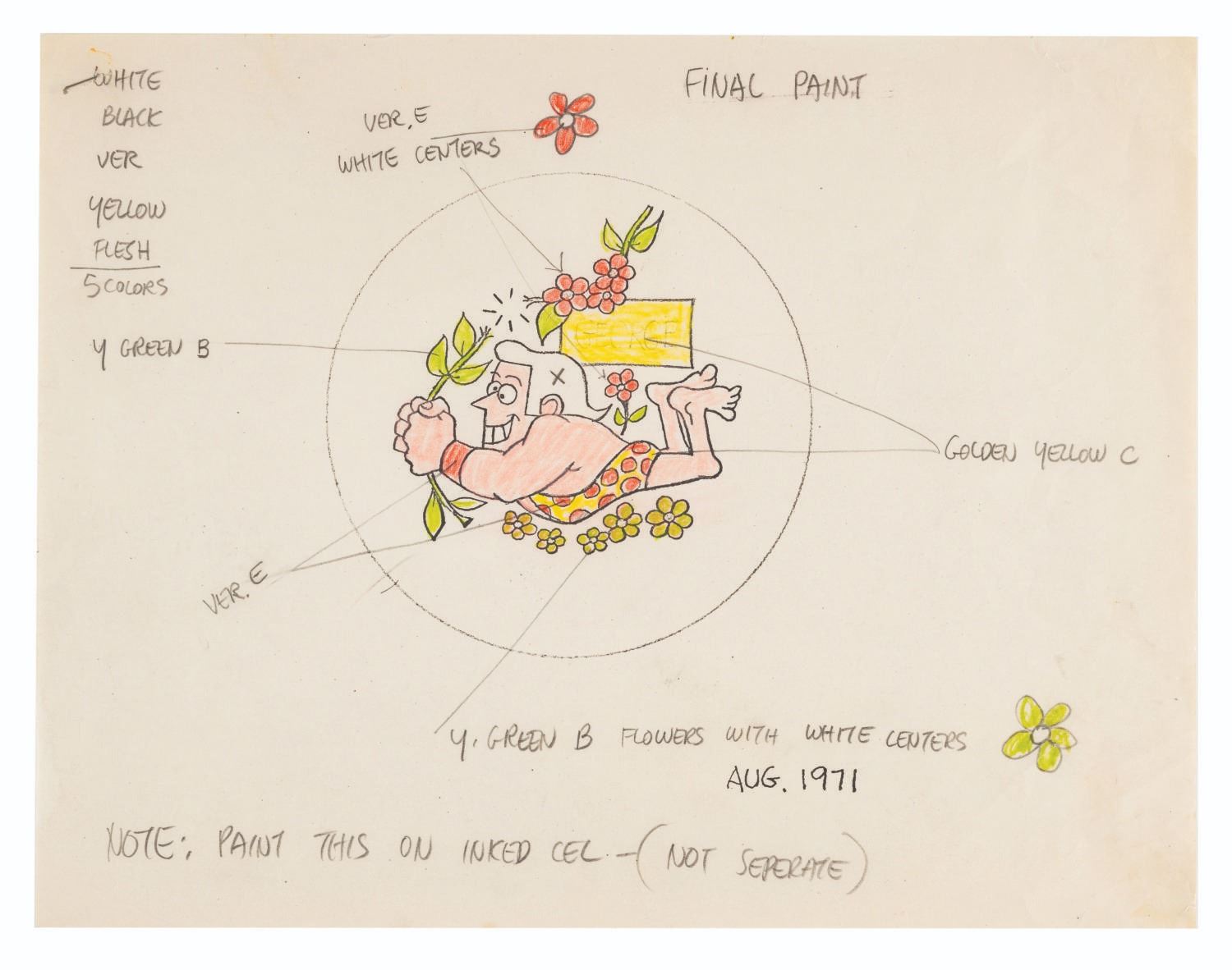 (Ward, 1971) An original color key drawing used for a “George of the Jungle” t-shirt sold at the Dudley Do-Right Emporium, dated August 1971, the year it opened. With an image size of 3.5” x 3.5” on 8.5” x 11” paper, the graphite and color pencil drawing is in good condition with light creases, edge wear, tears up to 0.5”, a staple at the top left corner, and discoloration from age.