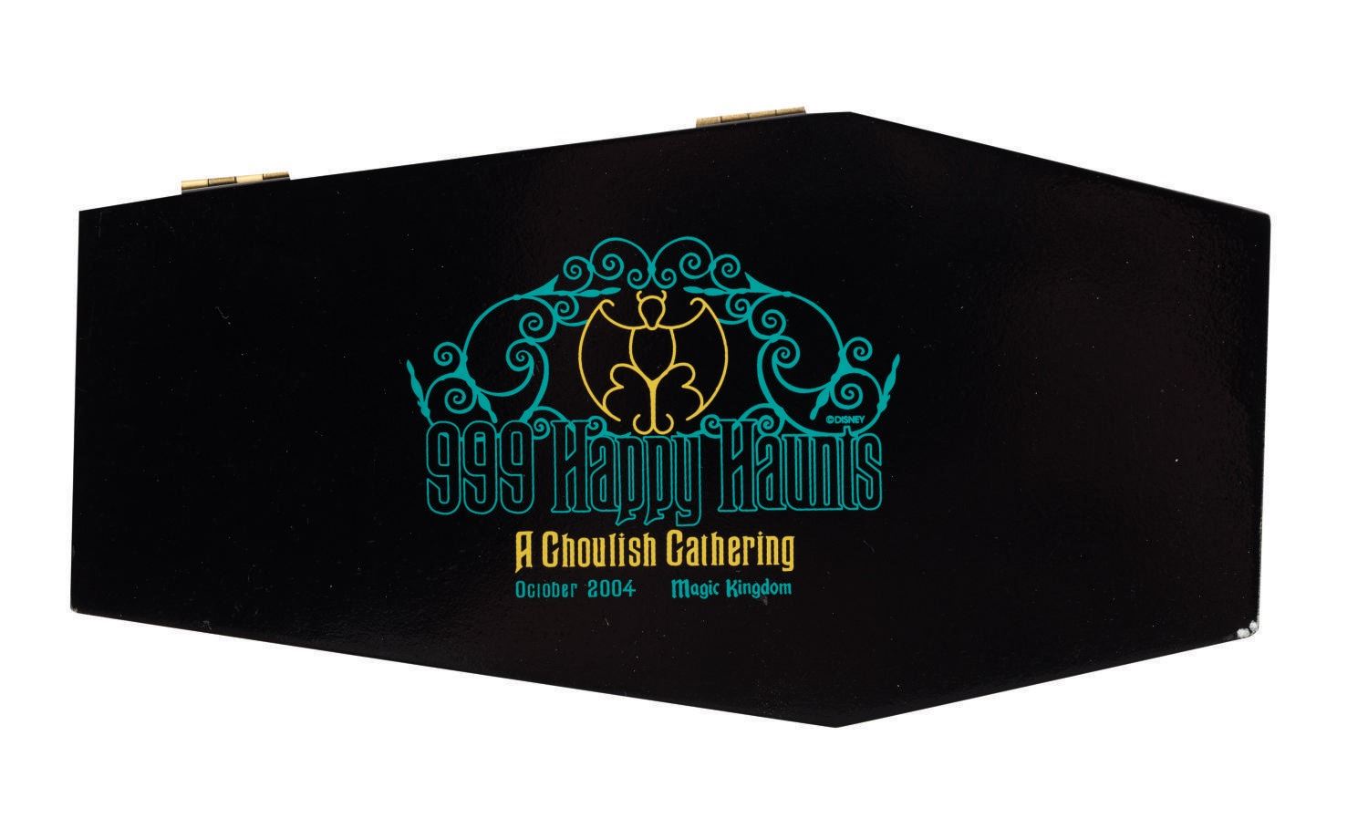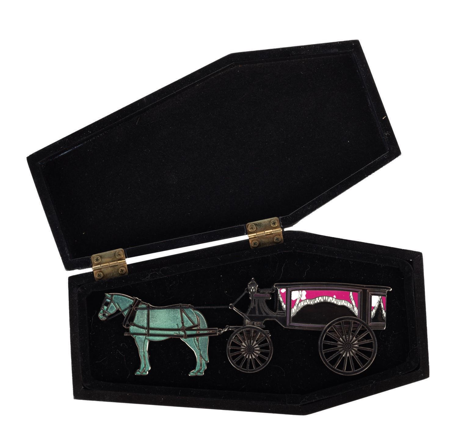 (Walt Disney World, 2004) A limited edition "A Ghoulish Gathering: A Deadly Delivery" pin released for the "999 Happy Haunts: A Ghoulish Gathering" event at The Magic Kingdom Park in Walt Disney World. The dual pin set depicts the Hearse with ghostly horse, featuring string and metallic tack tethering its pieces together and spinning wheels, limited to an edition of 500. Measuring approximately 1.75"x5.5", the pin comes encased within a commemorative 3.5"x6.75"x1" coffin-shaped box with hinged lid. The pin is in very fine, as-new condition, while the box is in very good condition, exhibiting few slight scuffs.