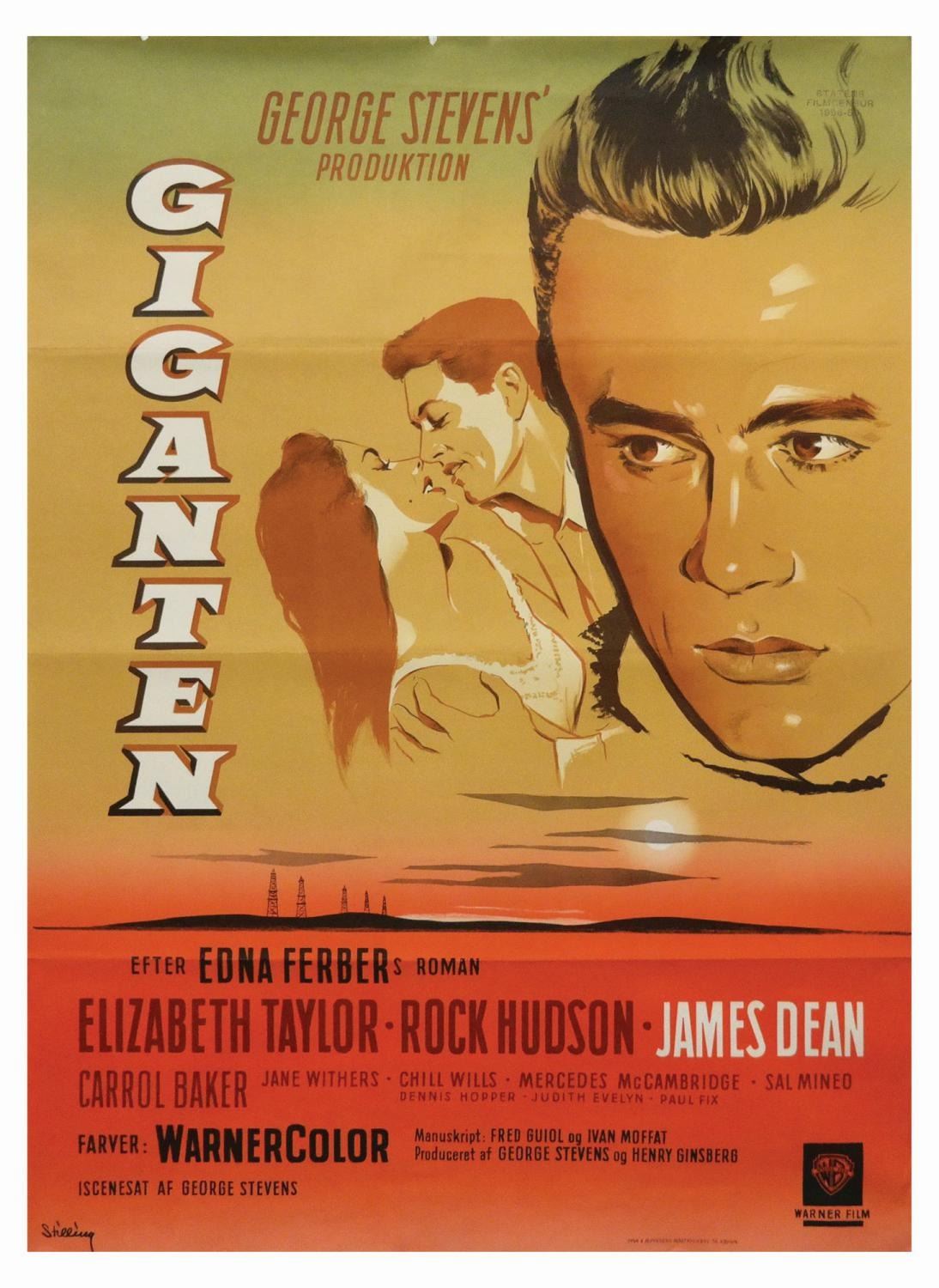(Warner Bros., 1958) A poster for the Danish theatrical release of the epic 1956 film "Giant" starring James Dean, Elizabeth Taylor, and Rock Hudson. Measuring 24.5" x 32.5", the poster displays in very good condition with folds, light creases, edge tears up to 0.5" long, a stamp at the top right, and a pencil inscription on the reverse.