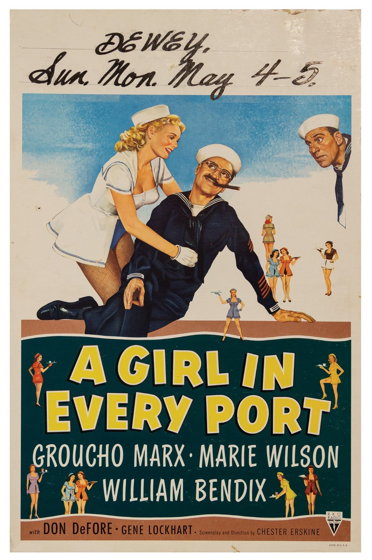 (RKO, 1952) A rare window card for A Girl in Every Port, starring Groucho Marx. Measuring 22"x14", the window card is in good condition with some surface scuffs and wear around the edges. The dates the theater originally showed the film are written along the top edge.