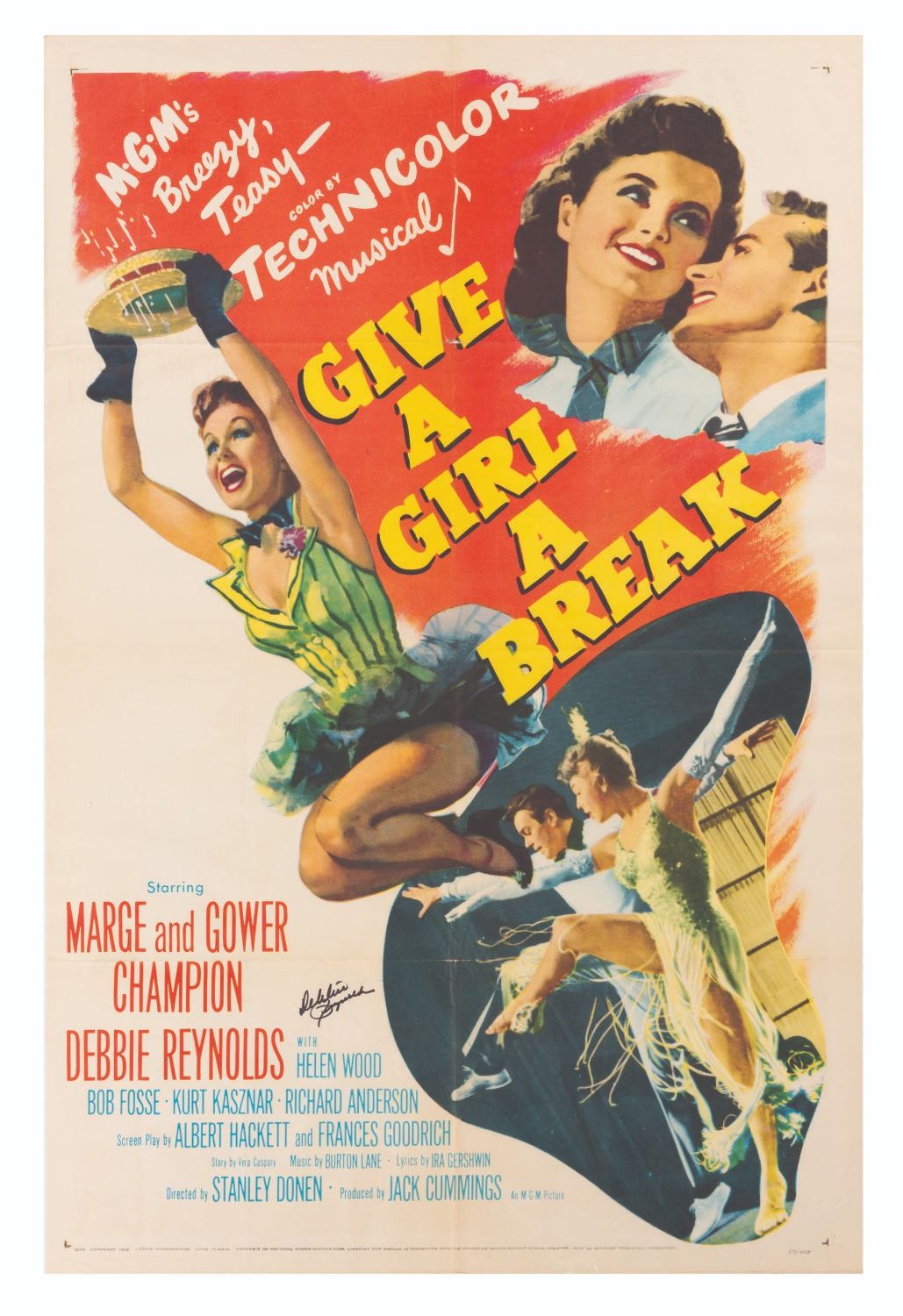 (MGM, 1953) An original theatrical one-sheet poster for “Give a Girl a Break” signed by Debbie Reynolds. Measuring 27” x 41”, the poster displays in good condition with light edge wear and a separation at the top center fold point.