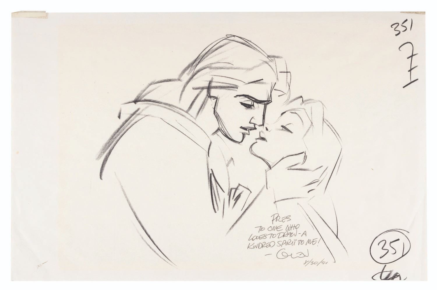 (Disney, 1991) A Studio-used photocopy of a Belle and the Prince production drawing from the end of “Beauty and the Beast,” signed by Disney Legend Glen Keane with a dedication to fellow animator Pres Romanillos. Measuring 11” x 17” overall, with a character image size of 9.75” x 10”, the photocopy is in good condition with light creasing and a 1.5” piece of tape to the top left edge.