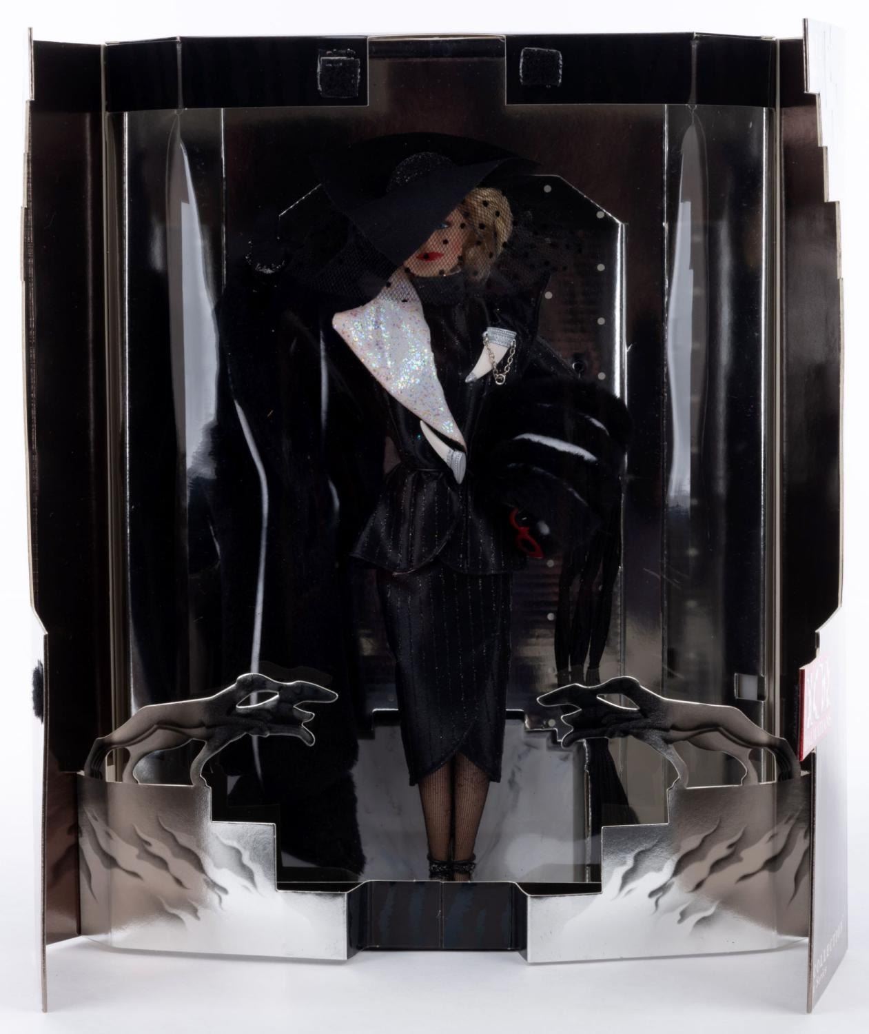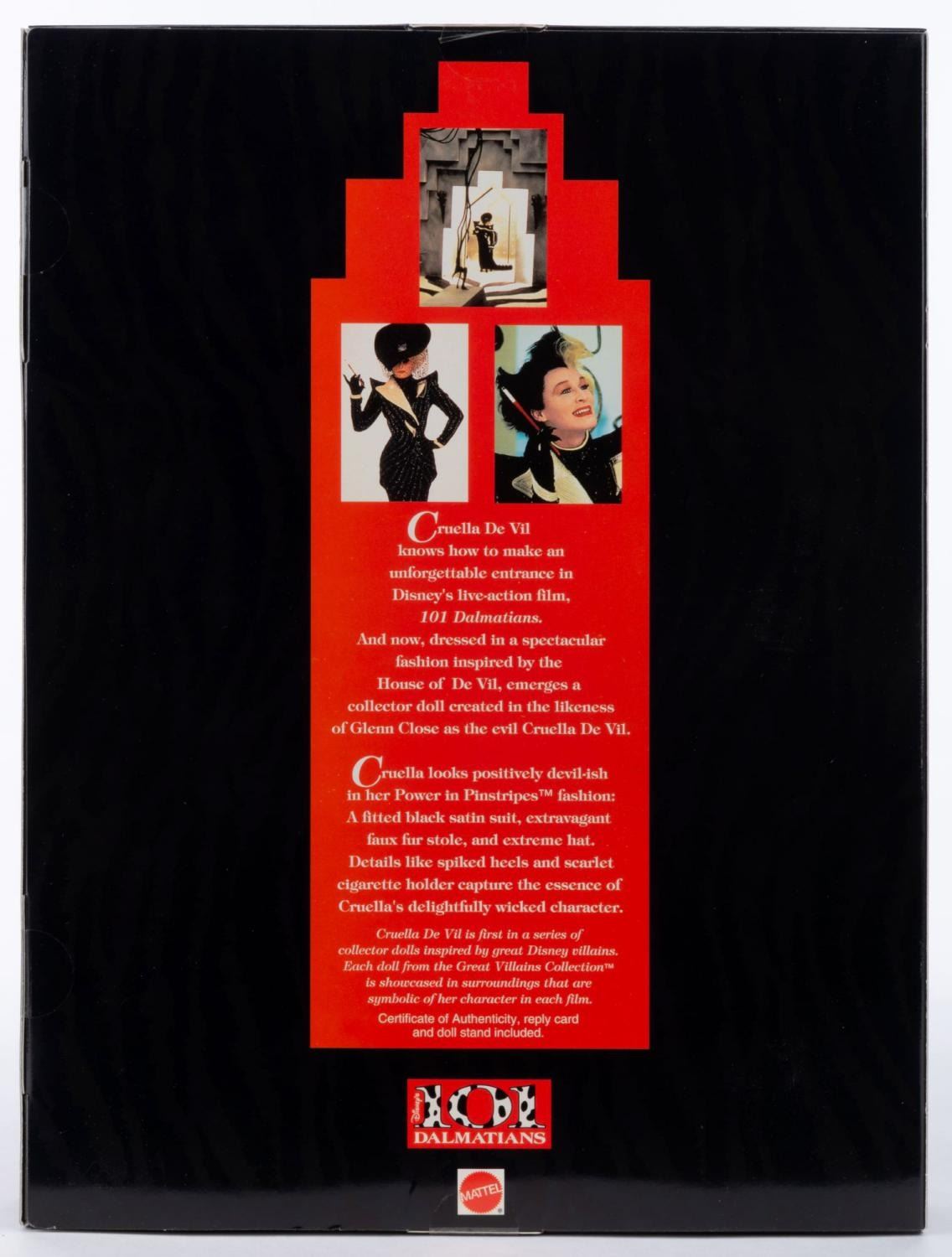 (Mattel, 1996) A Disney Great Villains Collection doll featuring the likeness of Glenn Close as the devilish Cruella de Vil. The “Power in Pinstripes” doll is the first in the series and was released in 1996 alongside the Disney Studios live-action “101 Dalmatians.” The doll comes within the original 10" x 3" x 13.5" box which opens with velcro for display. Measuring 3.5" x 2" and 12" tall, the doll is in fine condition sealed within the original packaging.