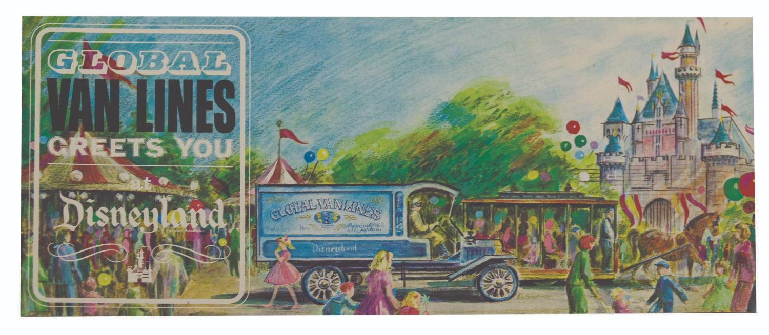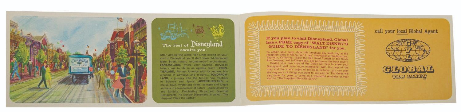 (Disneyland, 1970s) A Global Van Lines promotional Disneyland brochure. Lavishly illustrated with concept paintings and color photos, the 6-page booklet showcases Global Van Lines company-sponsored Main Street U.S.A. landmarks including the Global warehouse and their iconic 1910 Ford moving truck.  The back cover of the brochure was redeemable at the Park for a free copy of Walt Disney’s Guide to Disneyland. Measuring 4” x 9.25”, the brochure is in fine condition with only minor wear along the spine.