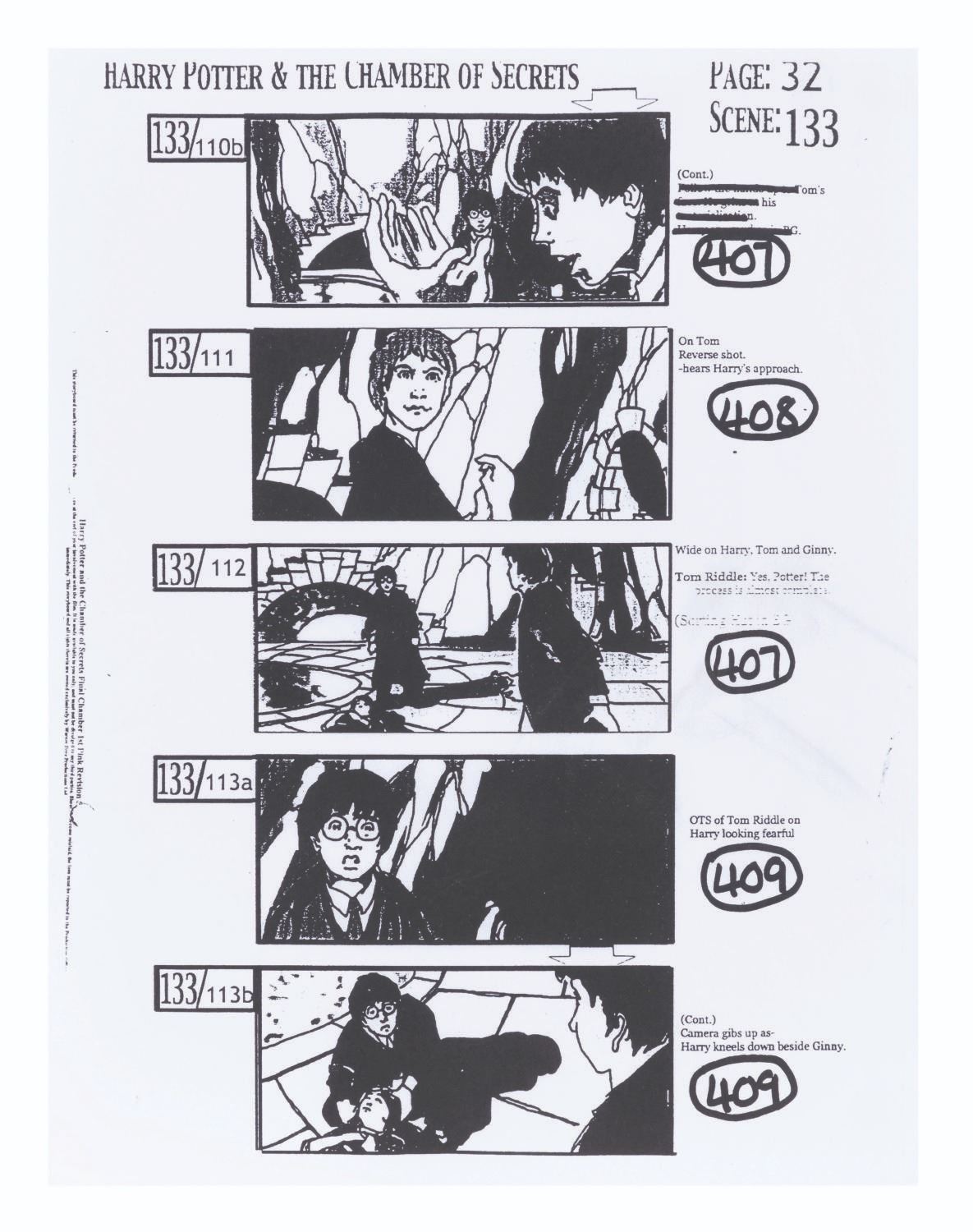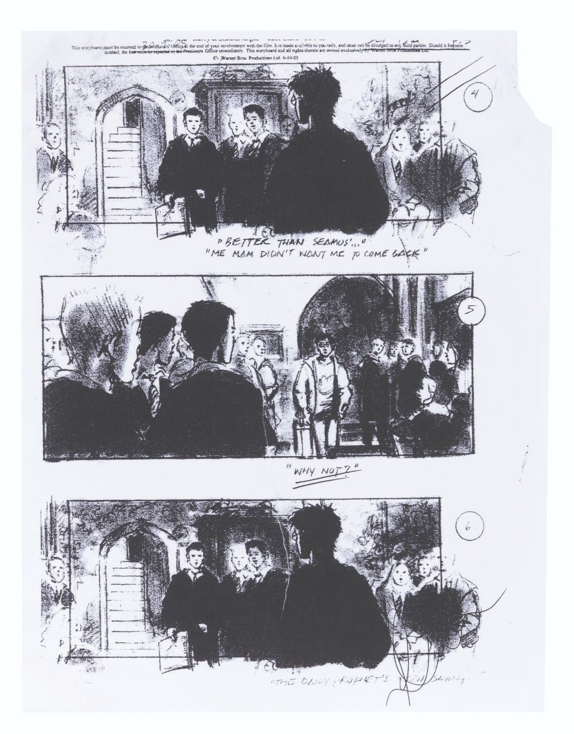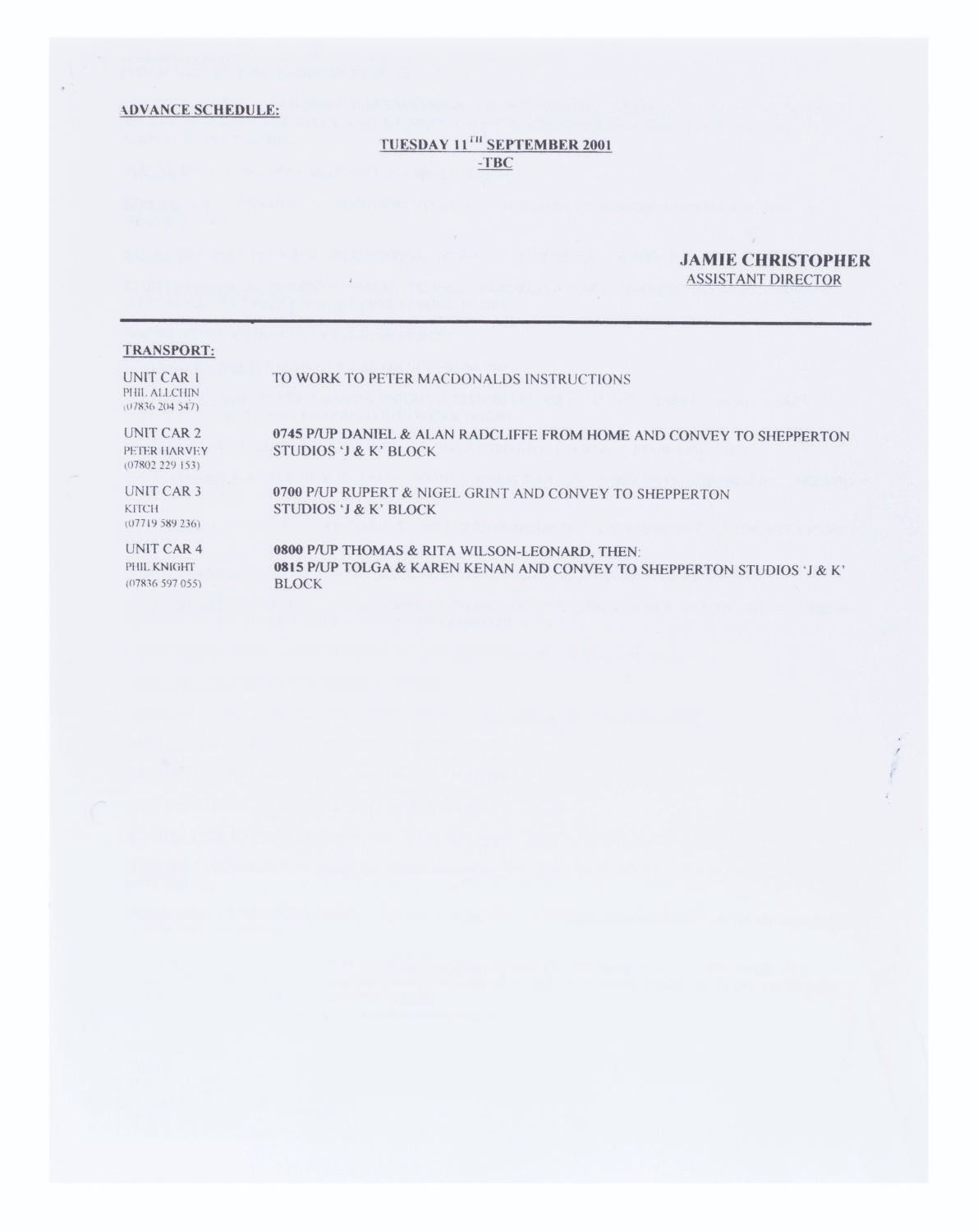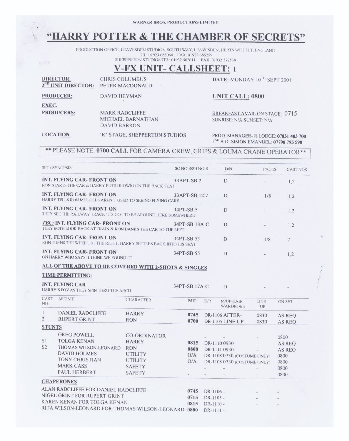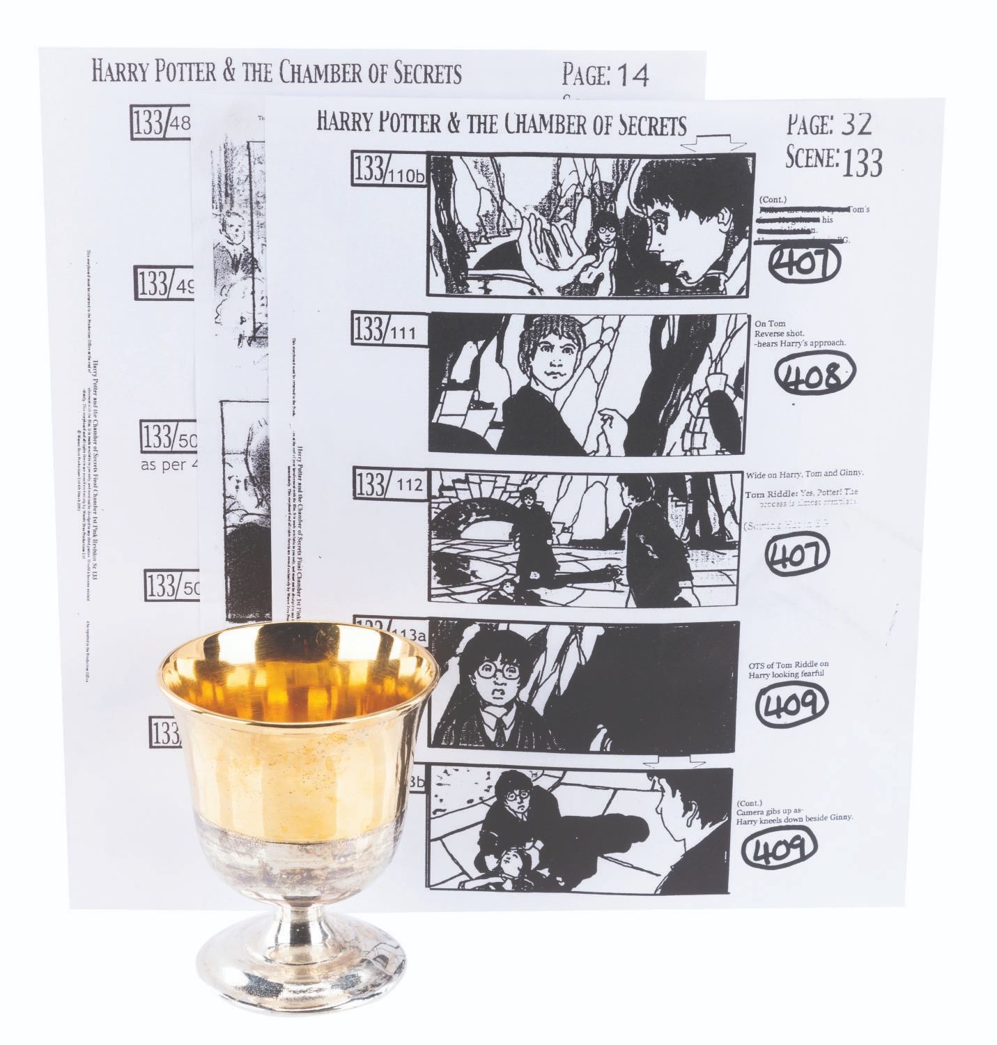 (Warner Bros., 2001) A Hogwarts Great Hall goblet prop and crew documents from production of "Harry Potter and the Chamber of Secrets.” The documents include an advance transportation schedule for Daniel Radcliffe (Harry Potter) and Rupert Grint (Ron Weasley) along with their chaperones and stunt doubles, two pages of a VFX unit call sheet for Radcliffe, Grint, and stunt doubles, and three pages of photocopy storyboards. Measuring 4.25” tall and 3.5” in diameter, the goblet is in good condition with scuffs, scratches, oxidation, and wear from production use. The documents range from 8.5” x 11” to 8.25” x 11.5”, and are in good condition with creases, wear from production use, and a large tear at the top right corner of one storyboard page.