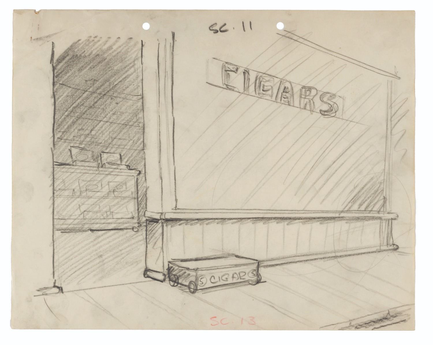 (Schlesinger, 1935) An original layout drawing of a cigar store from the Looney Tunes short “Gold Diggers of '49,” likely drawn by Tex Avery. Measuring 9.5” x 12”, the graphite drawing is in good condition with edge wear, creasing to the upper and bottom left corners, a paperclip oxidization stain to the reverse which is visible from the front, and light discoloration from age.