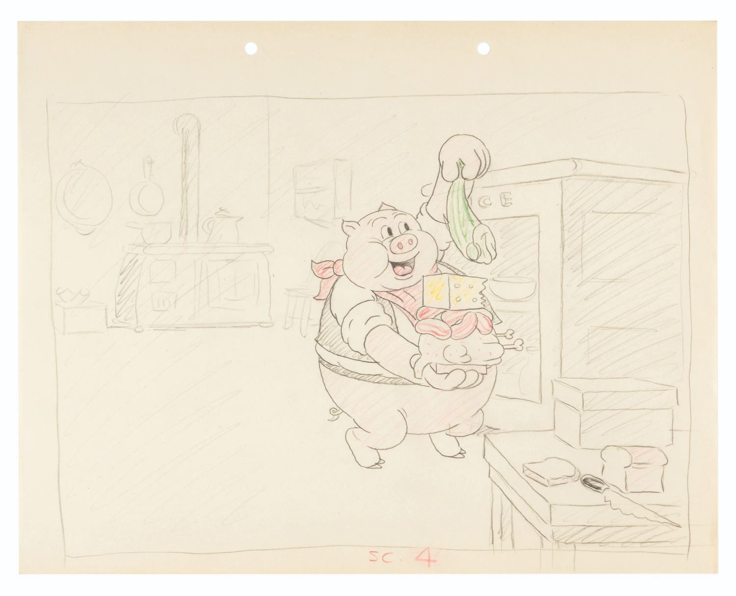(Schlesinger, 1935) An original layout drawing of Porky Pig from “Gold Diggers of ’49.” With a character image size of 8.25” x 11” on 9.5” x 12” animation paper, the graphite and colored pencil drawing is in very good condition with light edge wear and discoloration from age.