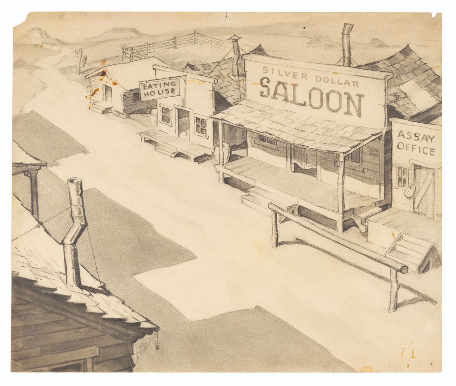 (Schlesinger, 1935) An original production background of a Western town from “Gold Diggers of ’49.” The short, directed by Tex Avery, was the second film to feature Porky. Accomplished in ink and watercolor and measuring 10.5” x 12.5”, the background is in good condition with stains, creases, pinholes from production use, and edge tears, particularly the top left corner.