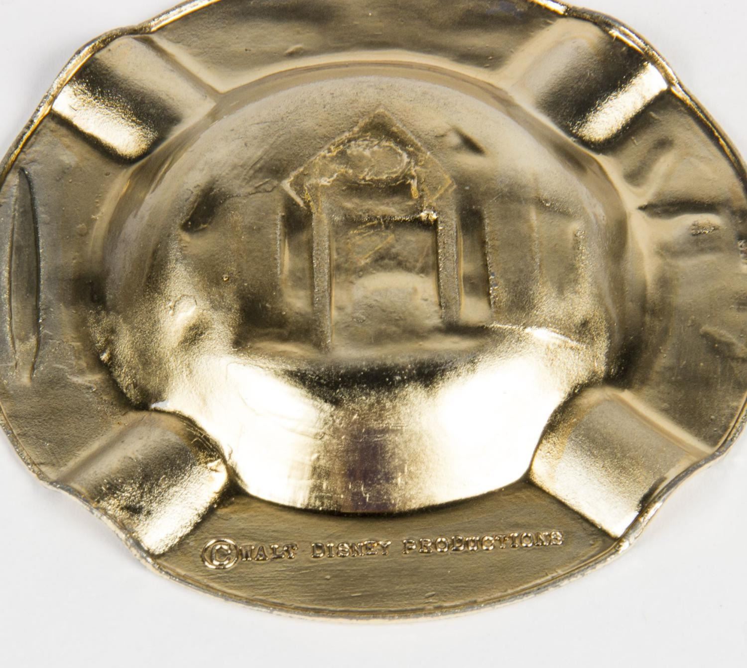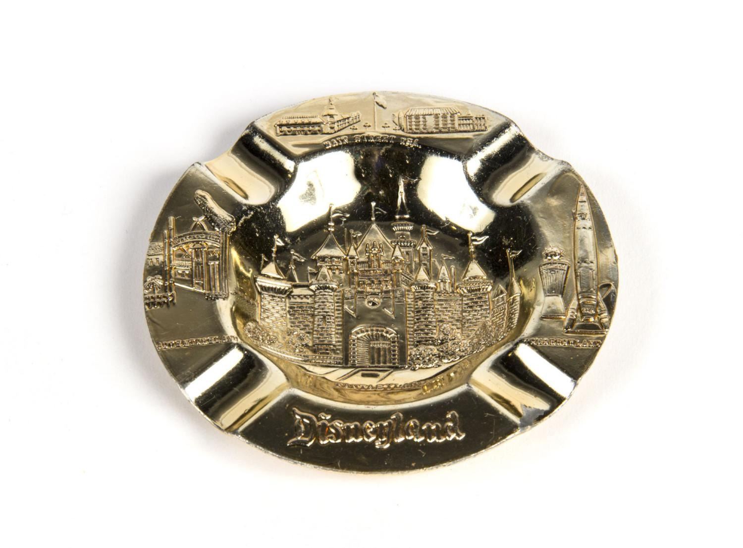 (Disneyland, 1958) A souvenir of Disneyland ashtray featuring the original Park lands and Sleeping Beauty Castle. Measuring 4.5" in diameter, the ashtray is in very good condition with some wear to portions of the gold-tone plating.
