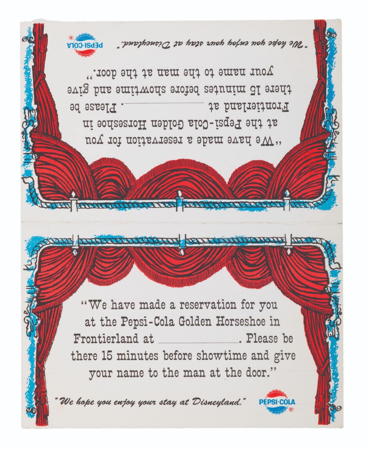 (Disneyland, 1962-69) An unused reservation card for the Golden Horseshoe Revue in Frontierland, sponsored by Pepsi-Cola. Measuring 5 " x 6.5 " unfolded, the card displays in good condition with creases, wear, scratches, and indentations from being written on top of.
