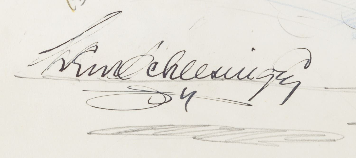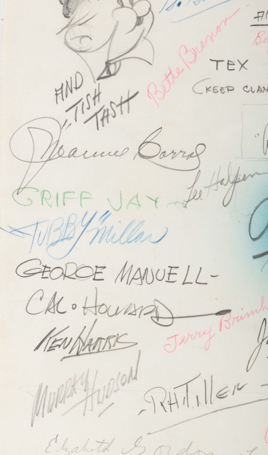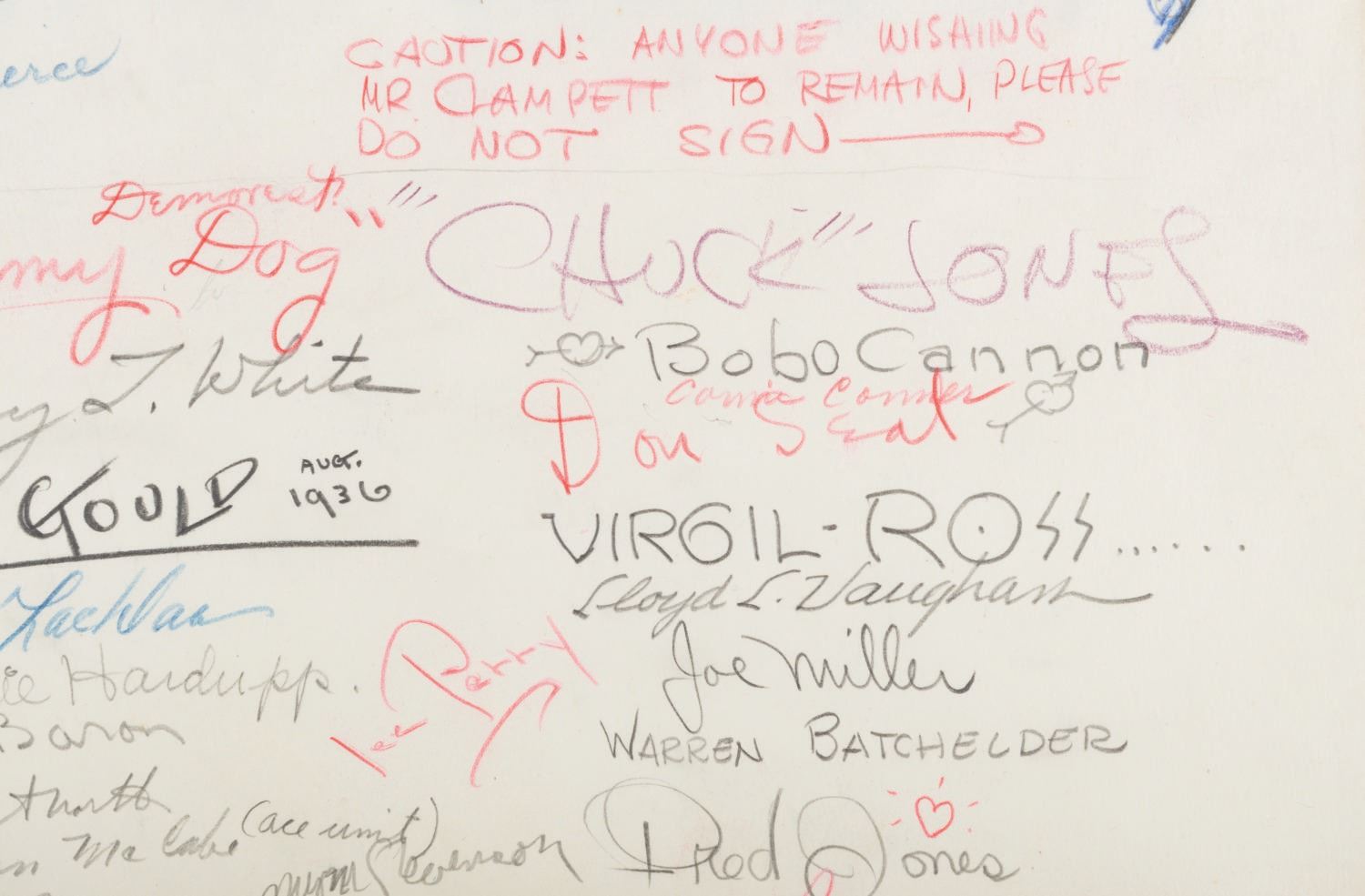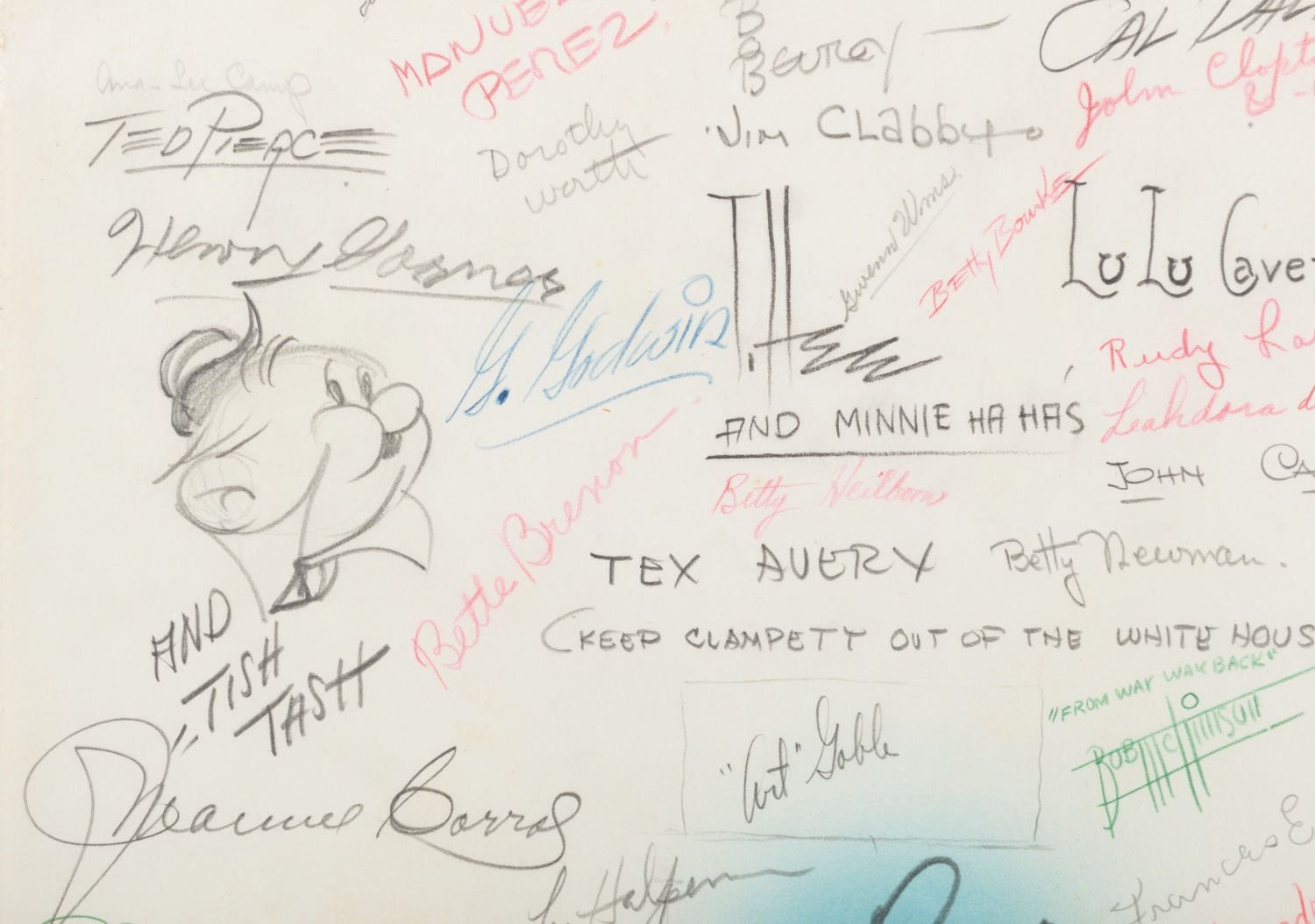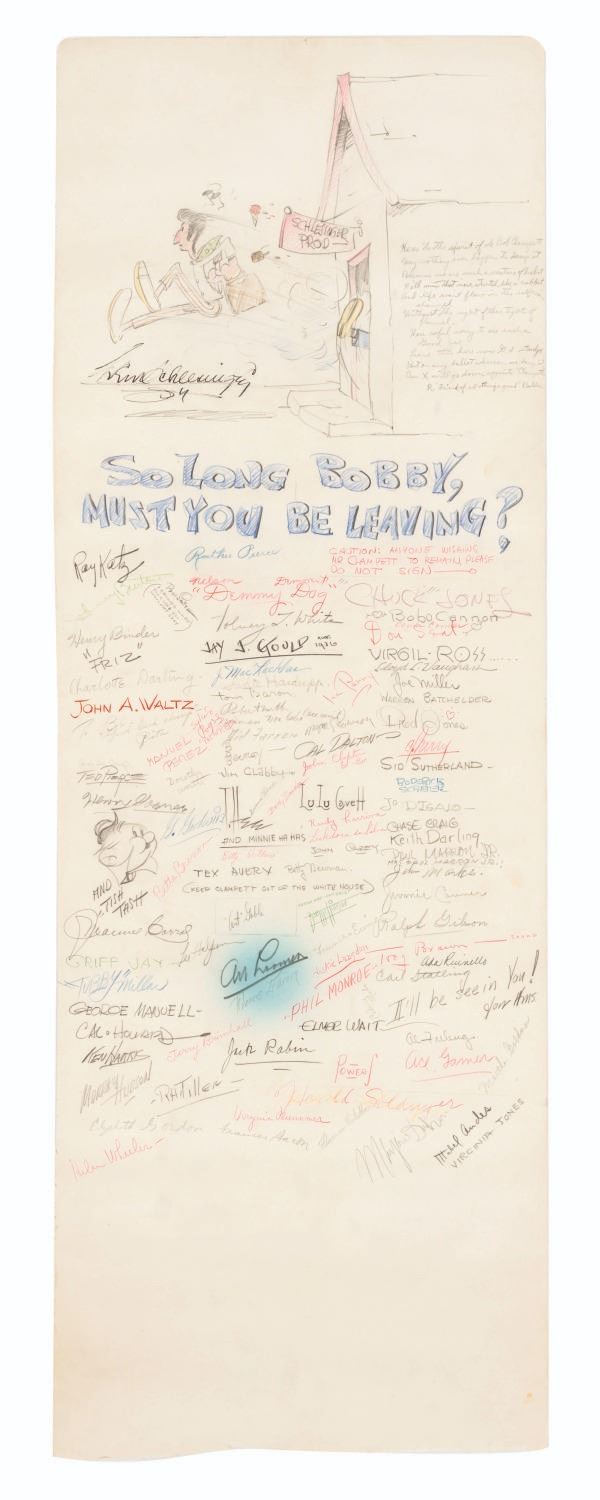 (Schlesinger, 1936) A goodbye drawing signed by the staff of Leon Schlesinger Productions given to Bob Clampett when he left the studio in 1936. The card features a hand-drawn illustration of Bob being given the boot from the studio, a farewell poem, and 103 signatures including Leon Schlesinger, Chuck Jones, Tex Avery, Friz Freleng, Bob McKimson, and Carl Stalling. Accomplished in graphite, colored pencil, and ink, and measuring 35.25” x 12.25”, the drawing has been rolled and displays in very good condition with light edge wear and creasing from handling and light discoloration from age.