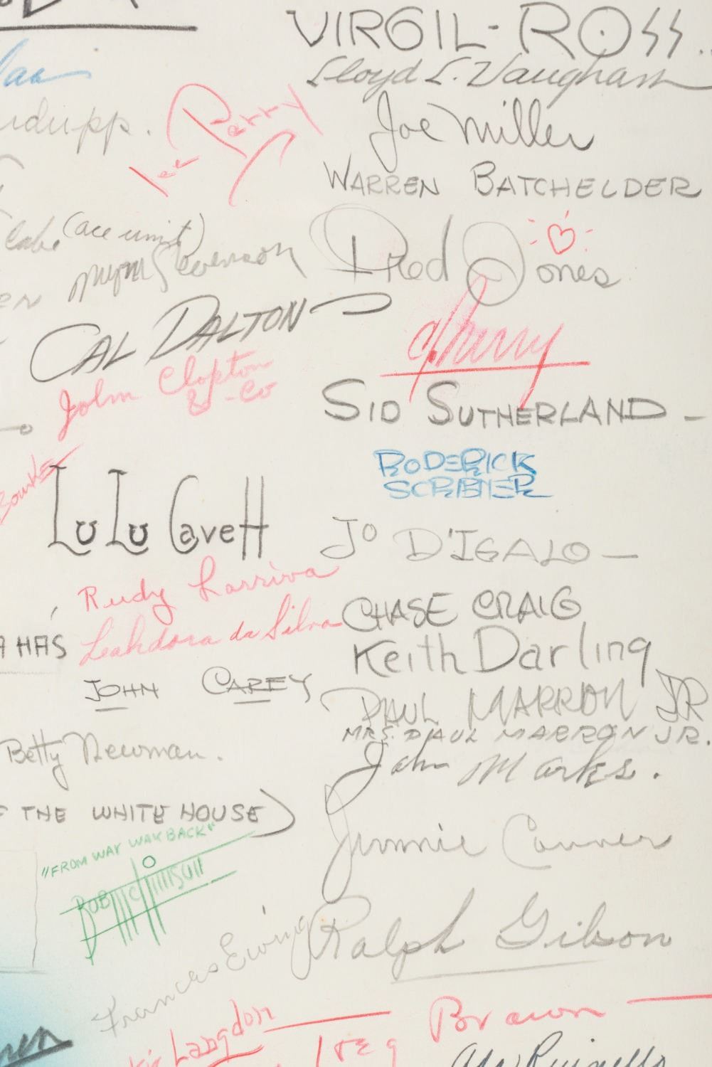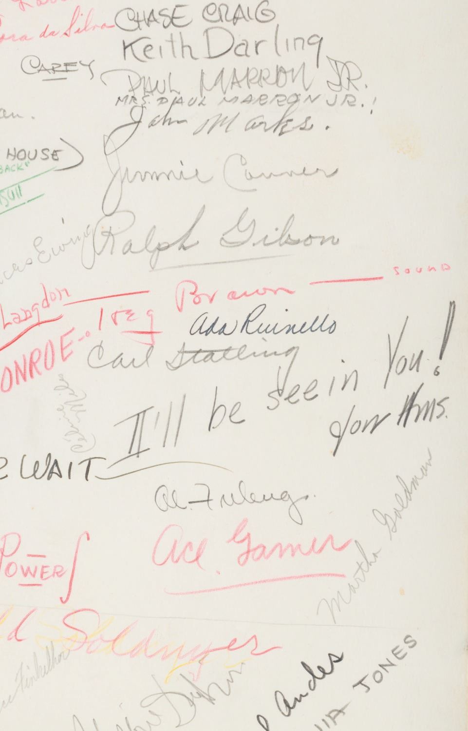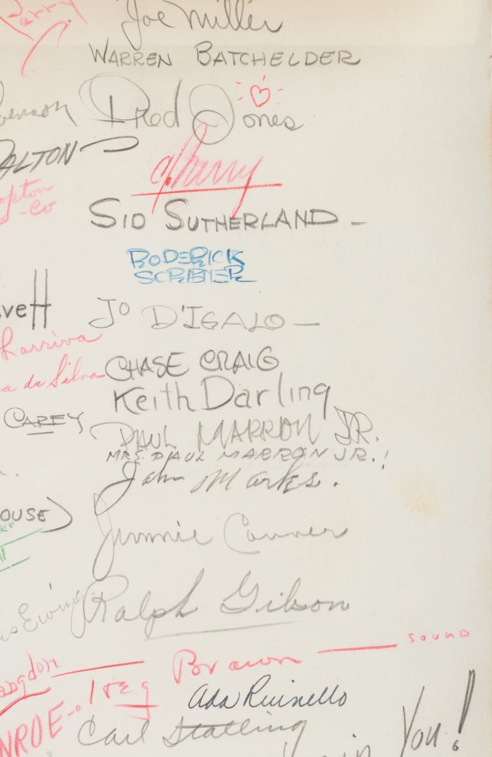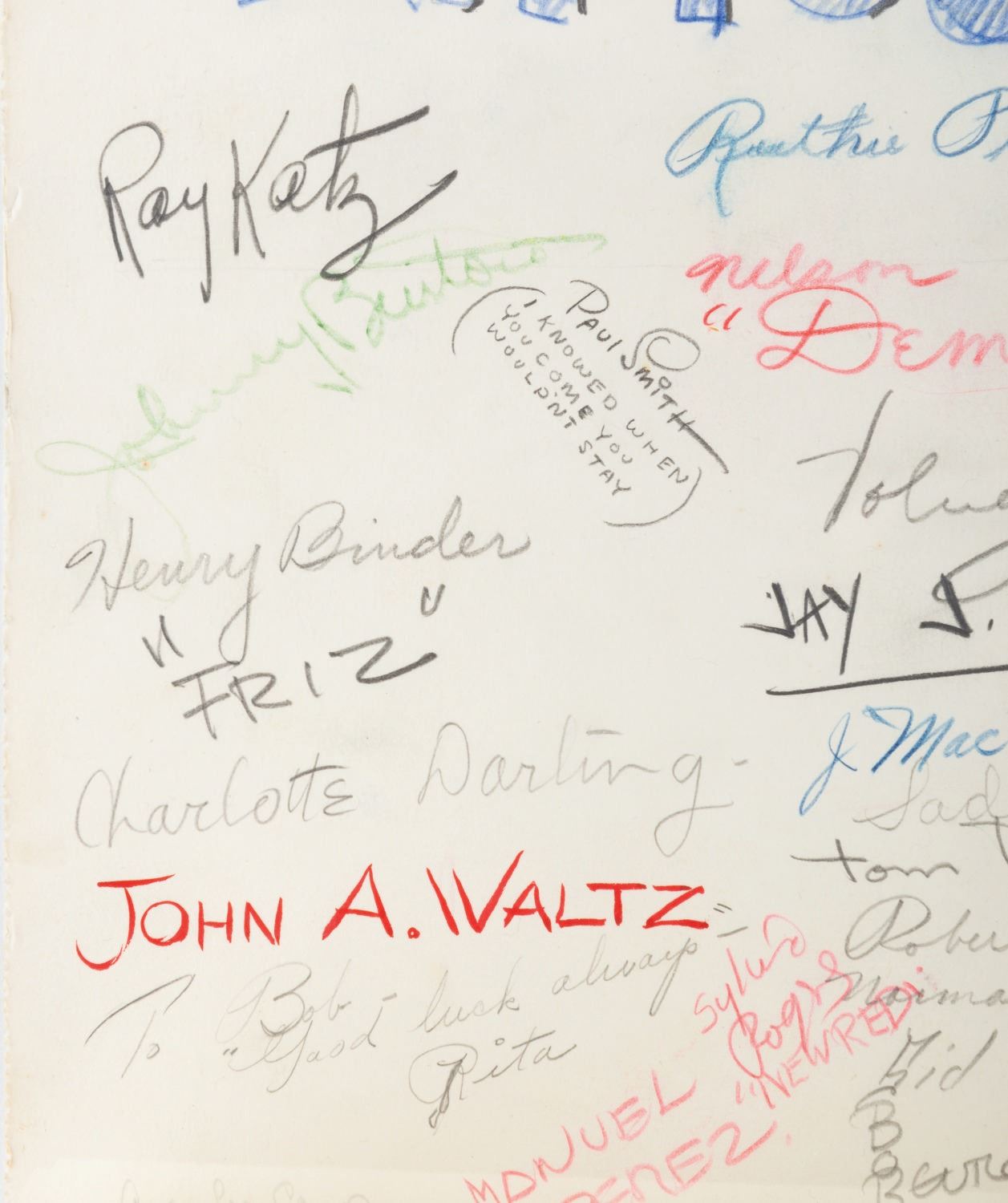 (Schlesinger, 1936) A goodbye drawing signed by the staff of Leon Schlesinger Productions given to Bob Clampett when he left the studio in 1936. The card features a hand-drawn illustration of Bob being given the boot from the studio, a farewell poem, and 103 signatures including Leon Schlesinger, Chuck Jones, Tex Avery, Friz Freleng, Bob McKimson, and Carl Stalling. Accomplished in graphite, colored pencil, and ink, and measuring 35.25” x 12.25”, the drawing has been rolled and displays in very good condition with light edge wear and creasing from handling and light discoloration from age.