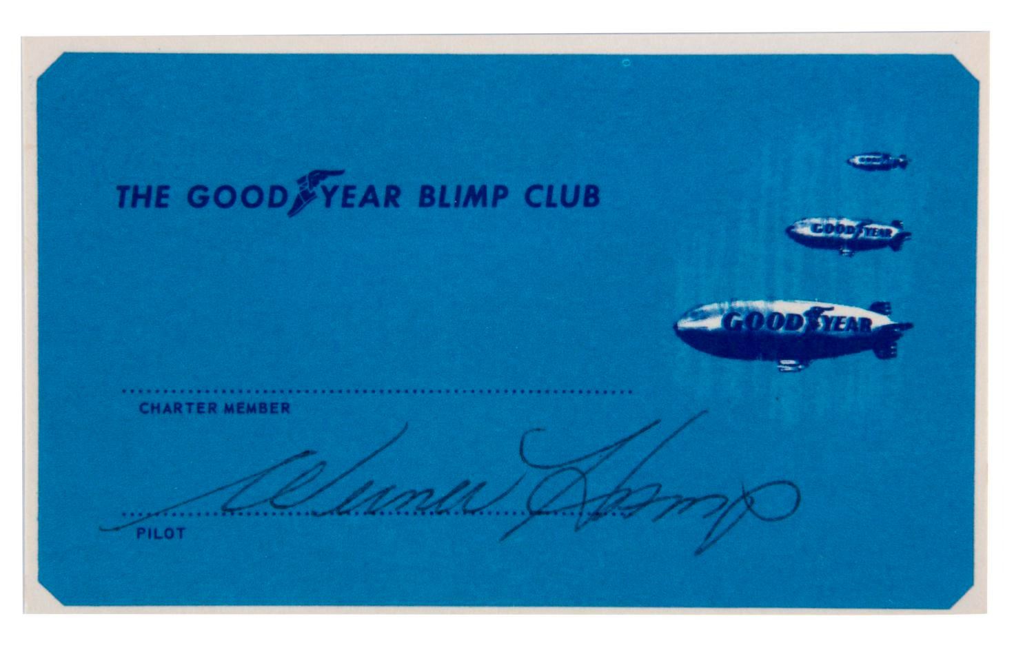 (Goodyear, 1970s-1980s) A very rare membership card for the Goodyear Blimp Club, signed by pilot Werner Hemp. Goodyear Company policy dictates that the only passengers allowed on their iconic blimps are Corporate Guests or members of the Press. This membership card in their"Blimp Club", awarded to a passenger, is the souvenir of one of those flights. Measuring 2"x3.5", the card is in very good condition.