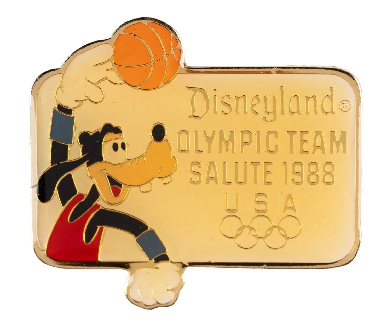 (Disneyland, 1988) A Disneyland Olympic Team Salute 1988 pin, featuring Goofy playing basketball. Measuring 1.5” wide, the pin is in very good condition with color shift from age.