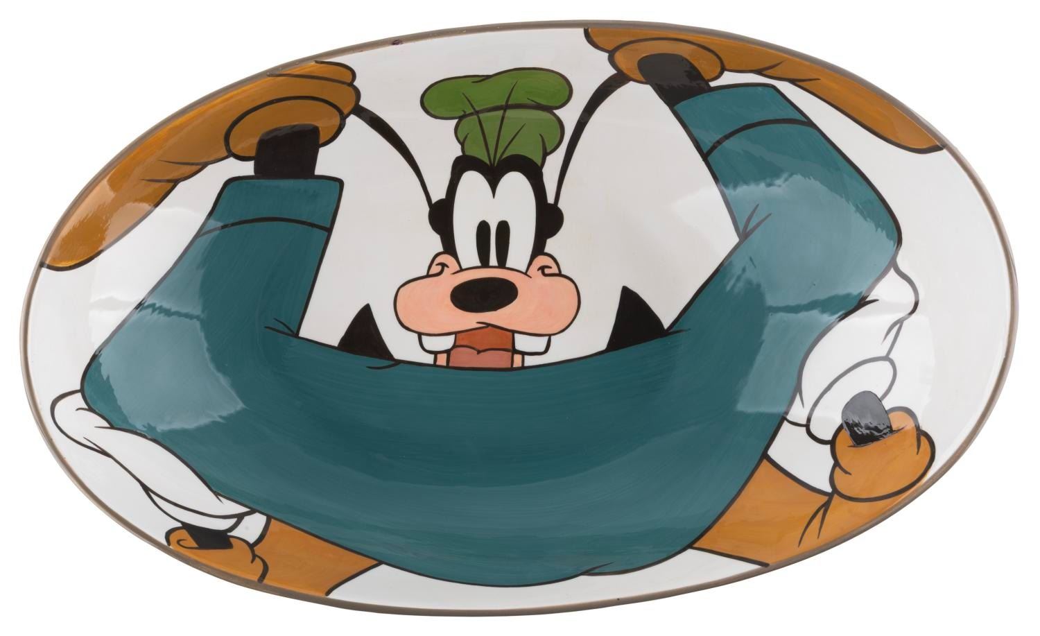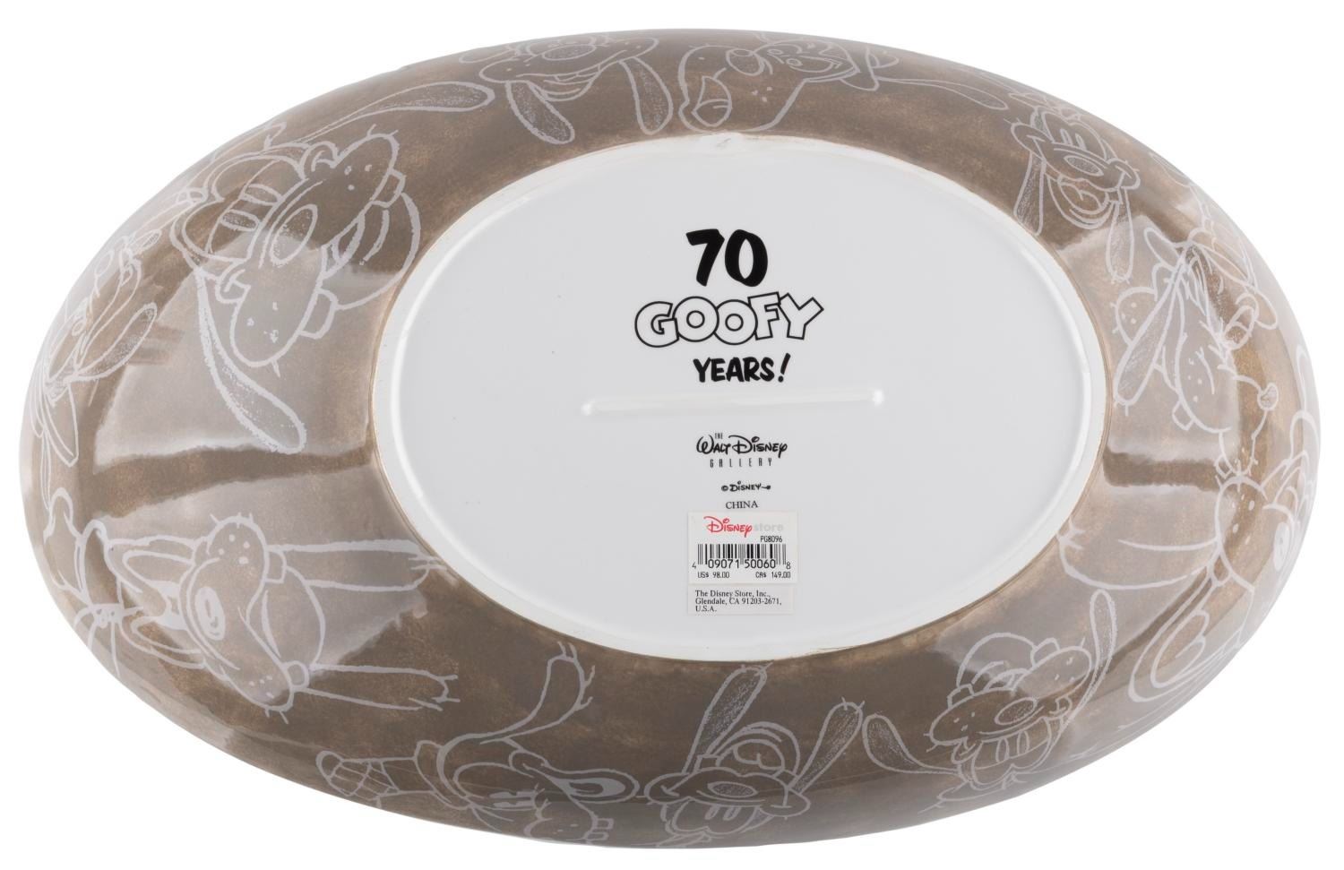 (Walt Disney Gallery, 2002) A ceramic serving platter celebrating Goofy’s 70th birthday, originally sold at the Walt Disney Gallery. Measuring 10 " x 17 " x 4.5 " tall, the platter is in fine condition.