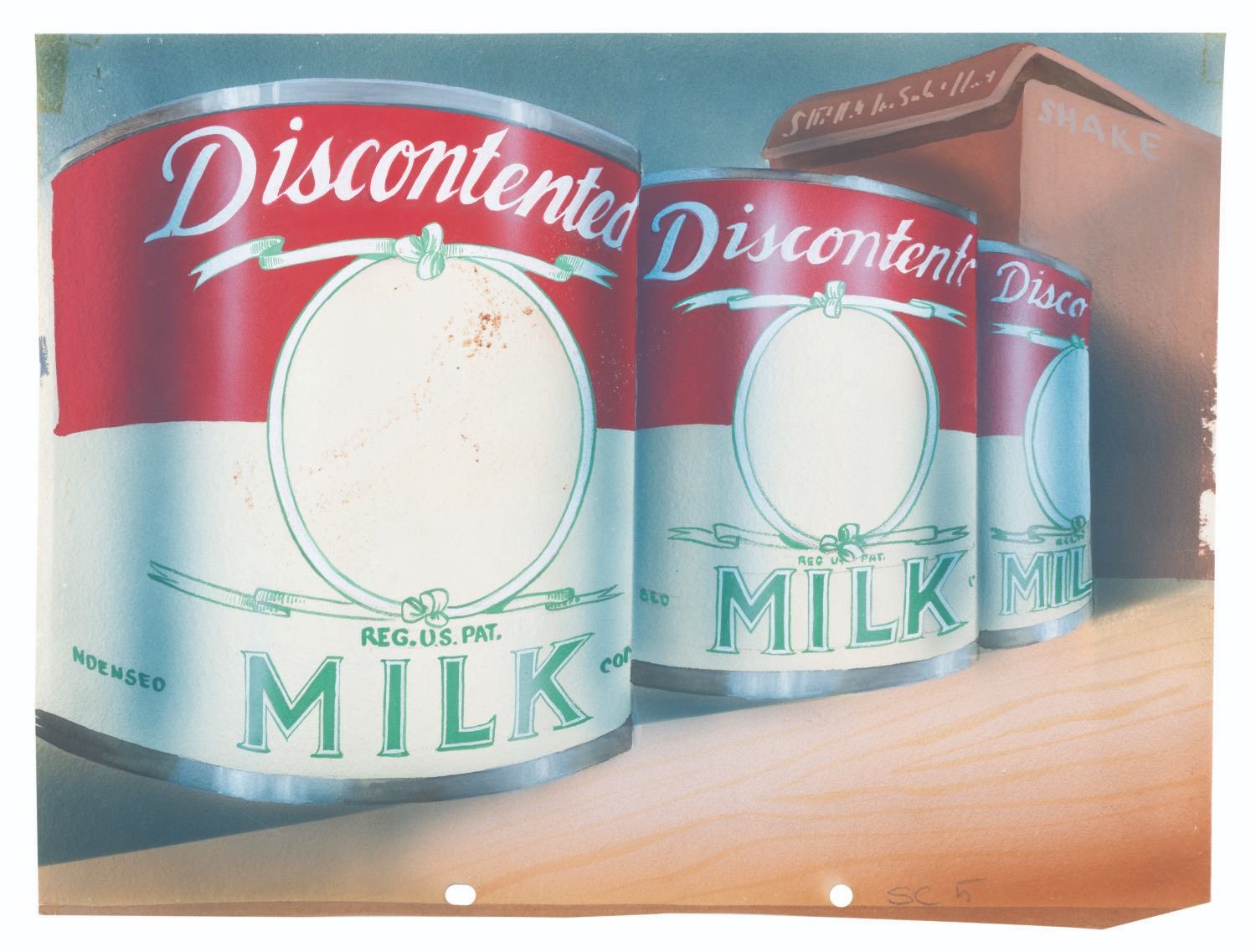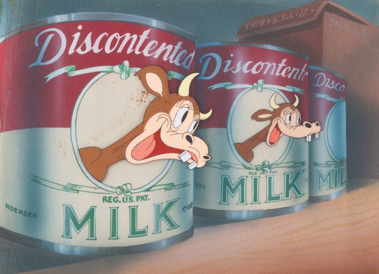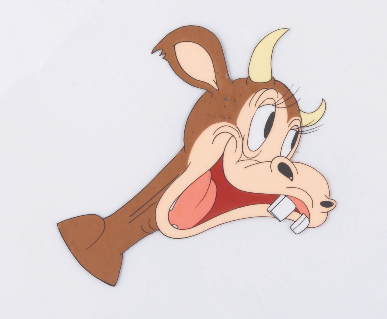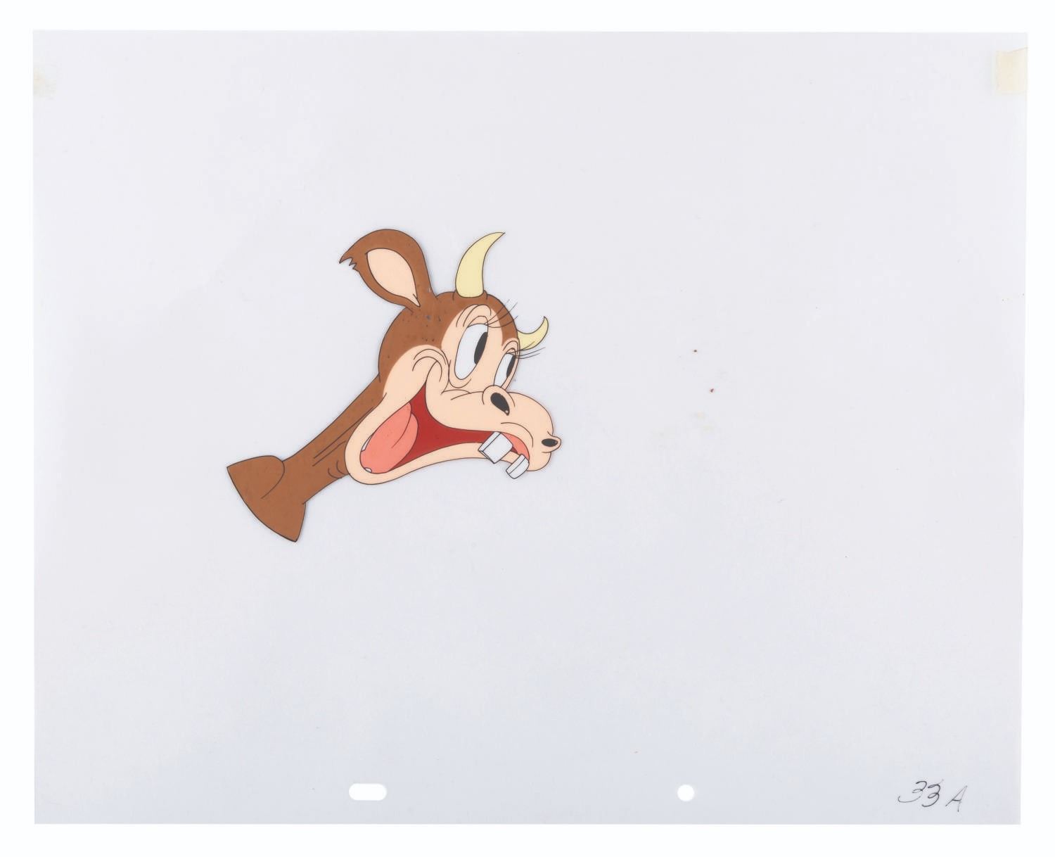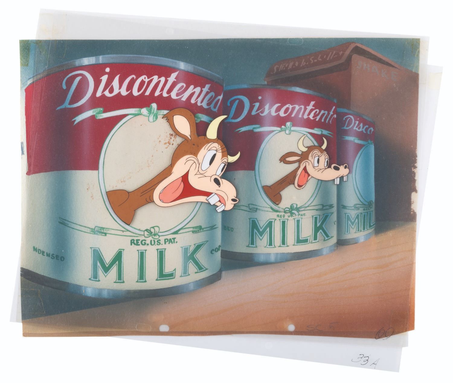 (Schlesinger, 1941) A multi-layer hand-painted cel and an original background from the Bob Clampett-directed short “Goofy Groceries.” With character image sizes from 2.5” x 2.75” to 4” x 4” on 10” x 12.5” cel layers and a 9.5” x 12.5” background, the piece displays in good condition with paint loss, paint transfer from the cels onto the background, tape residue from production use, scratches, and the bottom right corner of the background clipped.