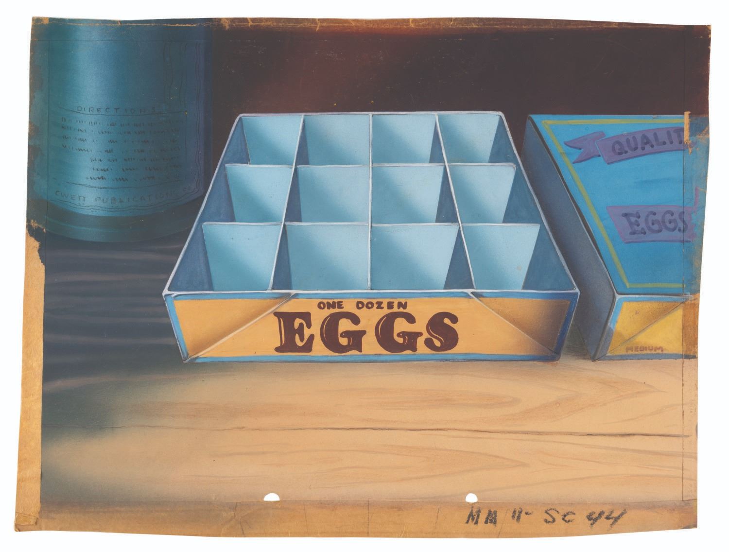 (Schlesinger, 1941) An original hand-painted egg carton production background from Merrie Melodies short “Goofy Groceries.” Measuring 10.25” x 13.5”, the background is accomplished on heavy paper and in good condition with scratches, wear, and material loss from tape, notably on the left side.
