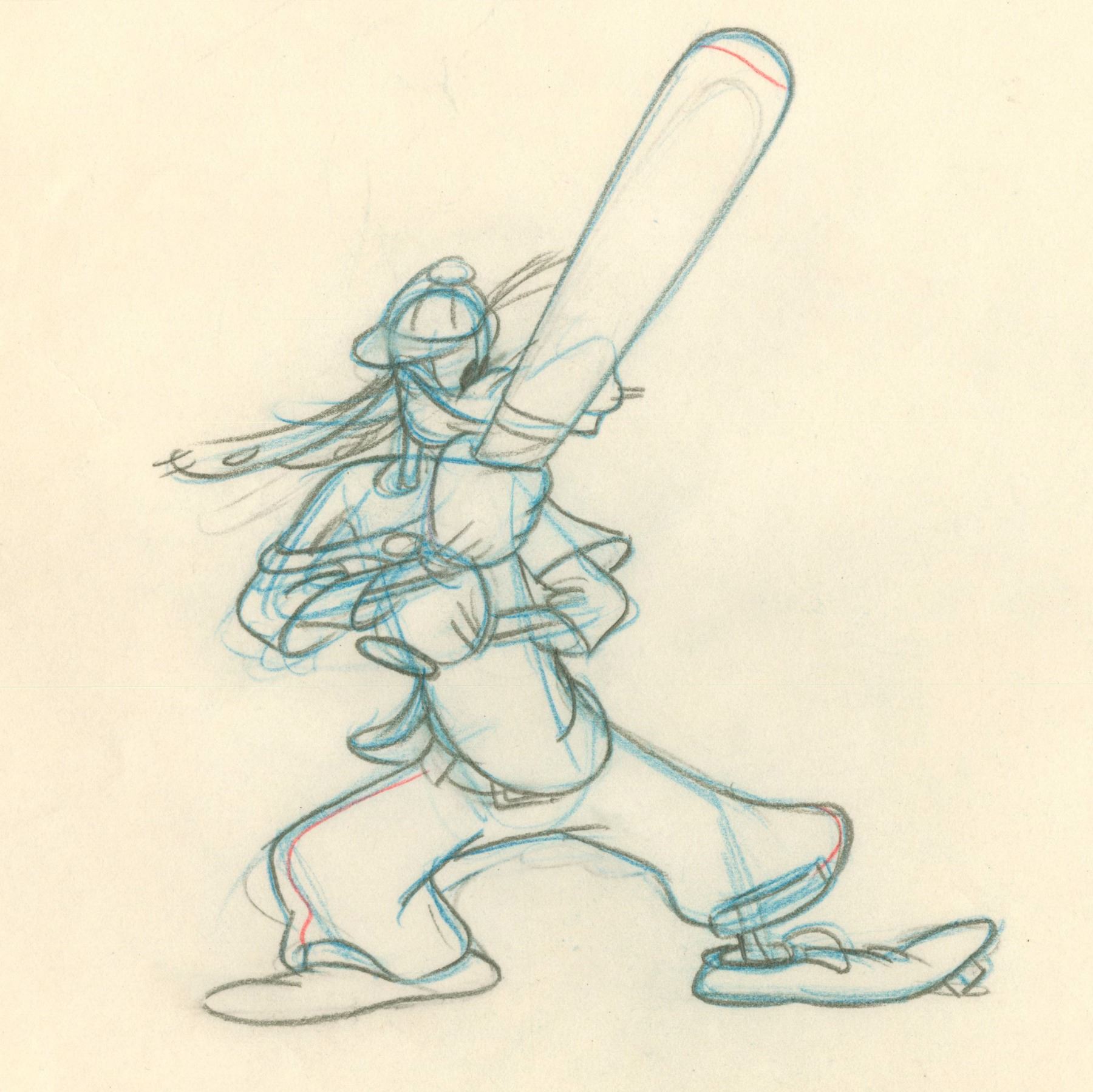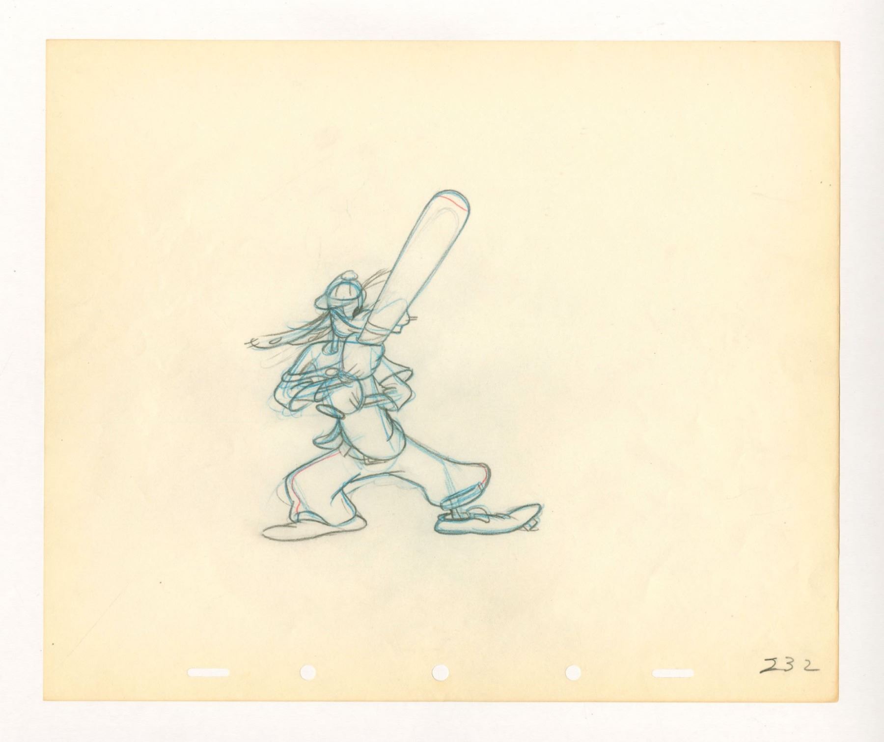 (Disney, 1942) An original production drawing of Goofy at the bat from "How to Play Baseball." Accomplished in graphite and color pencils with a character image size of 5.25" x4.5" on 10" x 12" animation paper, the drawing is in very good condition with page discoloration, particularly around the edges.